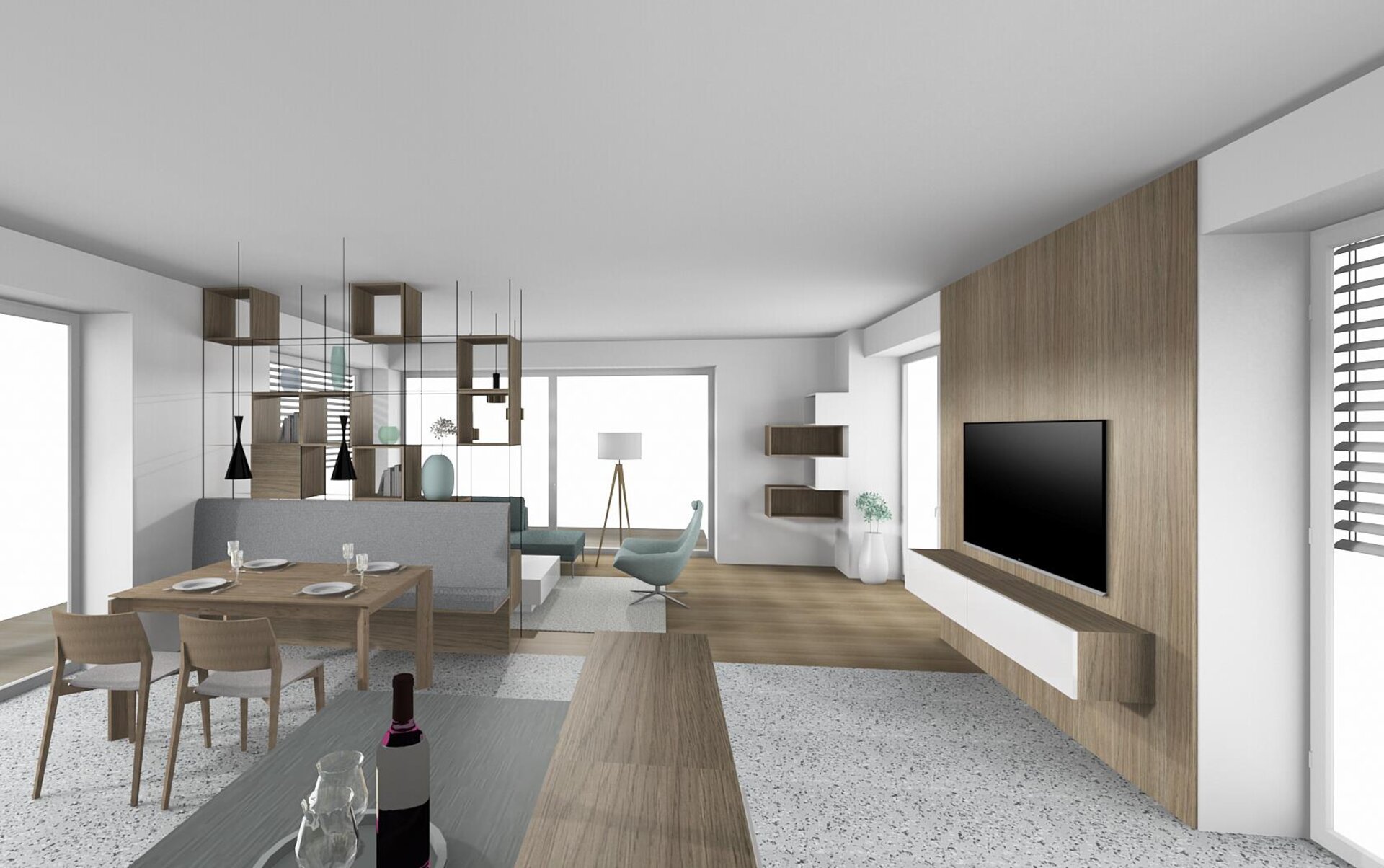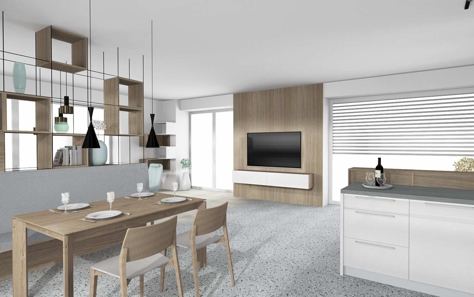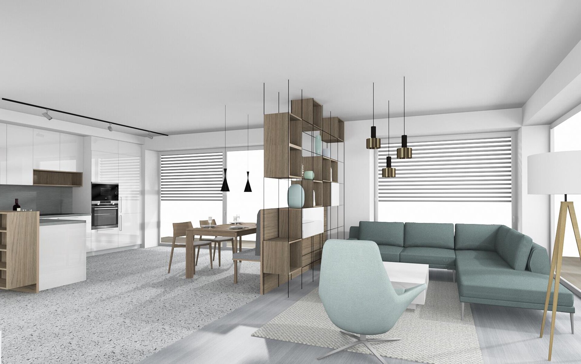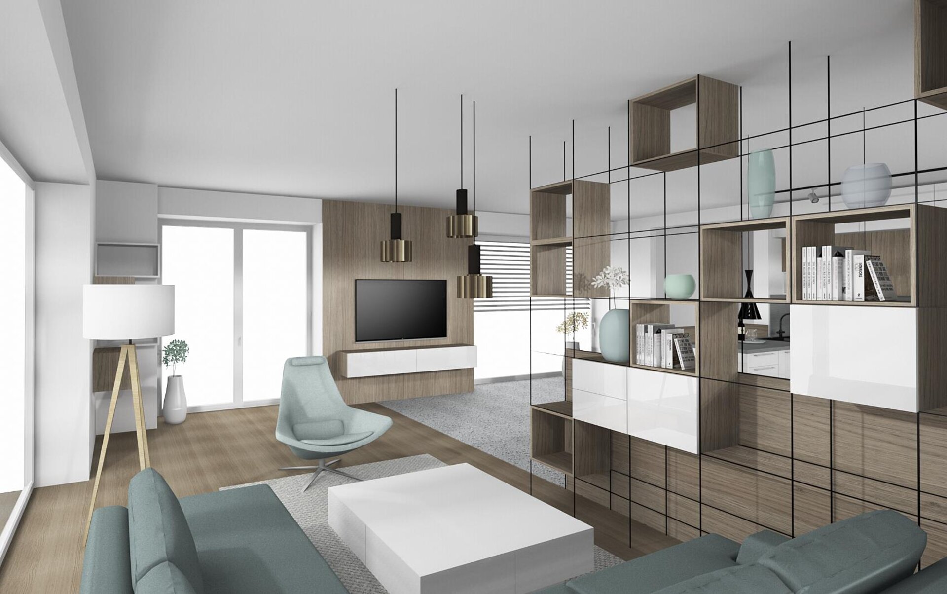 Ideová studie obytného prostoru s knihovnou oddělující kuchyňskou & jídelní část od části obývací.