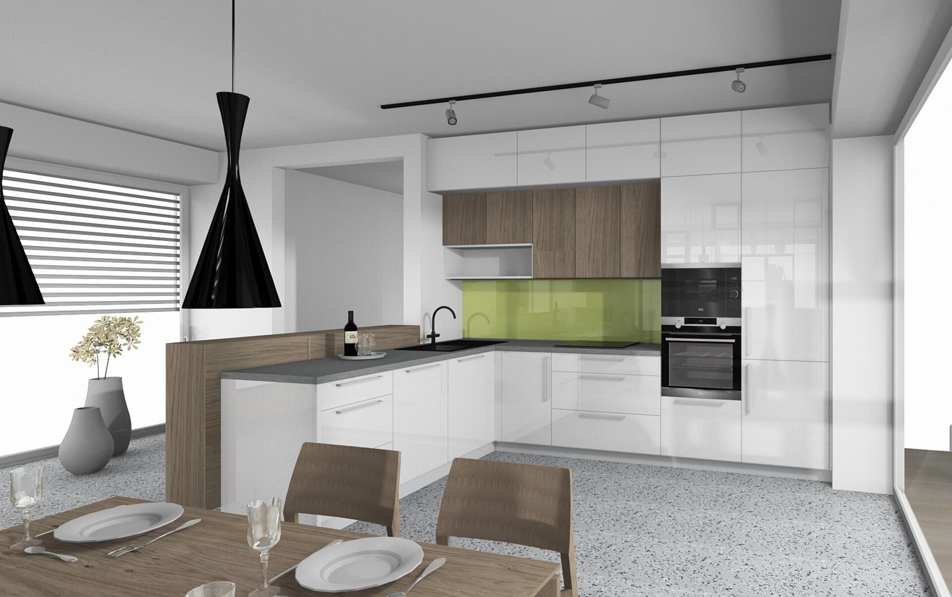 Zde kombinace bílého laku s přírodní dubovou dýhou.