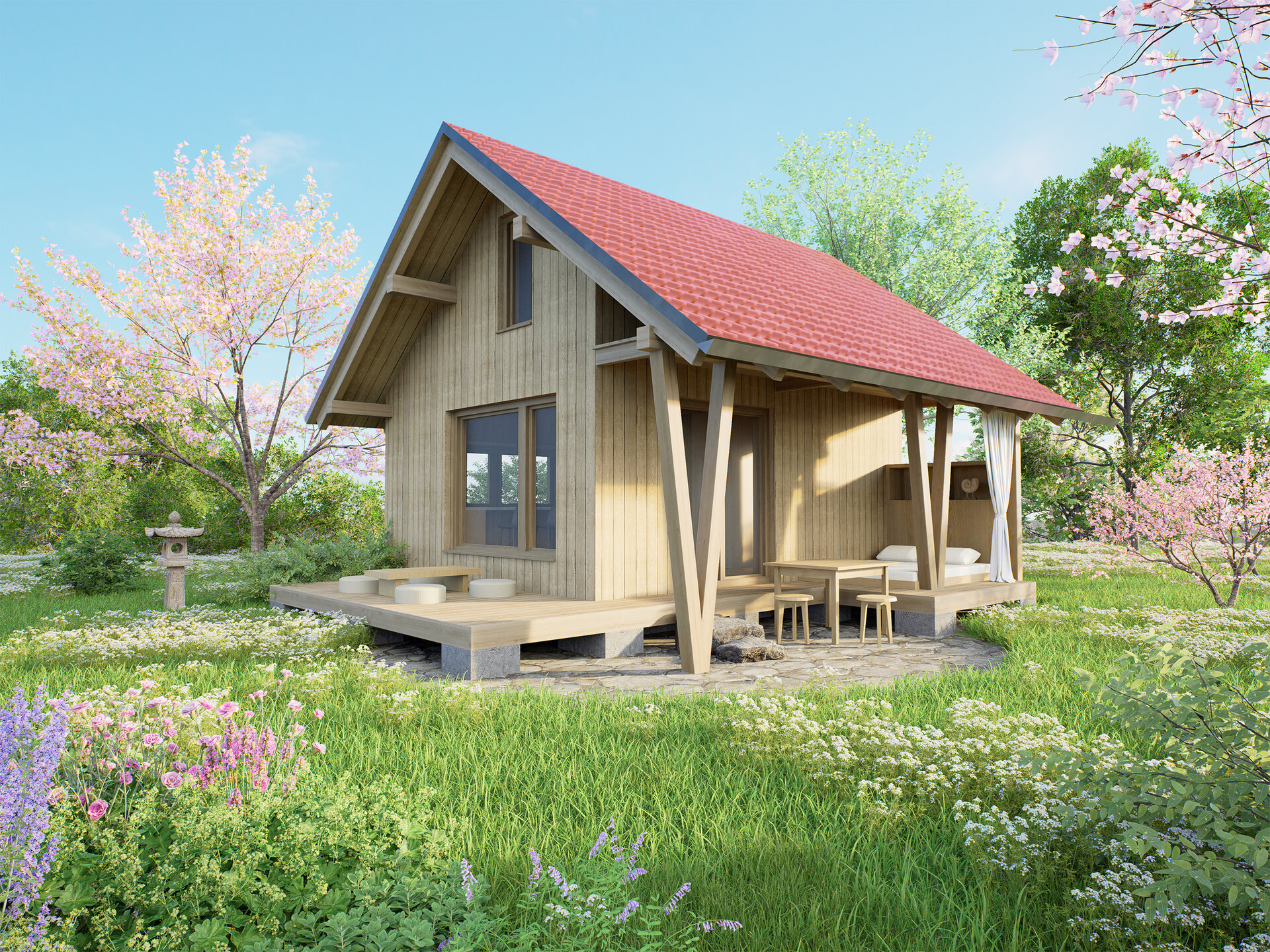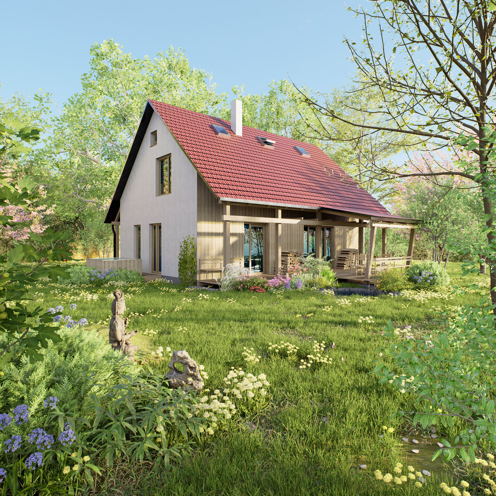 Architektura se tu nevnucuje – je prostá, má lidské měřítko a je přirozenou a harmonickou součástí zahrady.