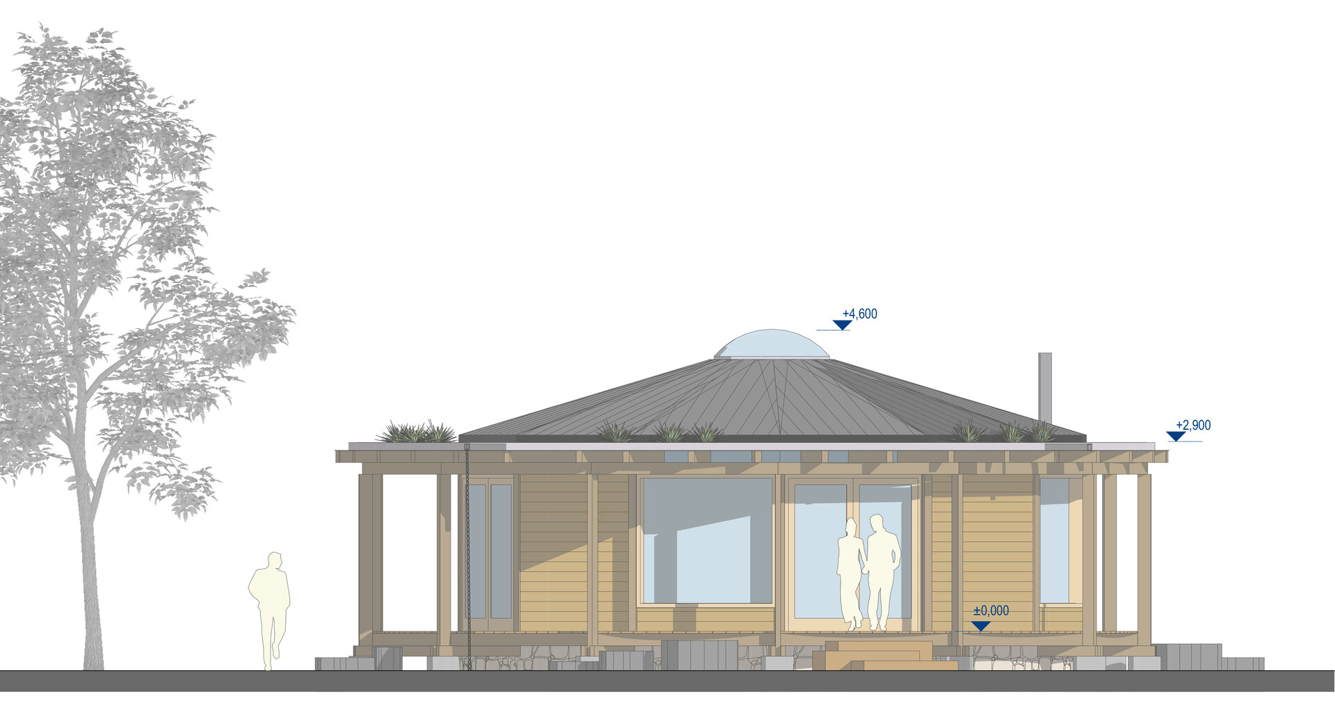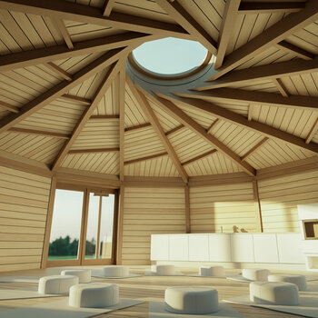 Dřevěná konstrukce střechy je řešena jako reciproční krov – soustava trámků, které se navzájem podpírají v dokonalé rovnováze.