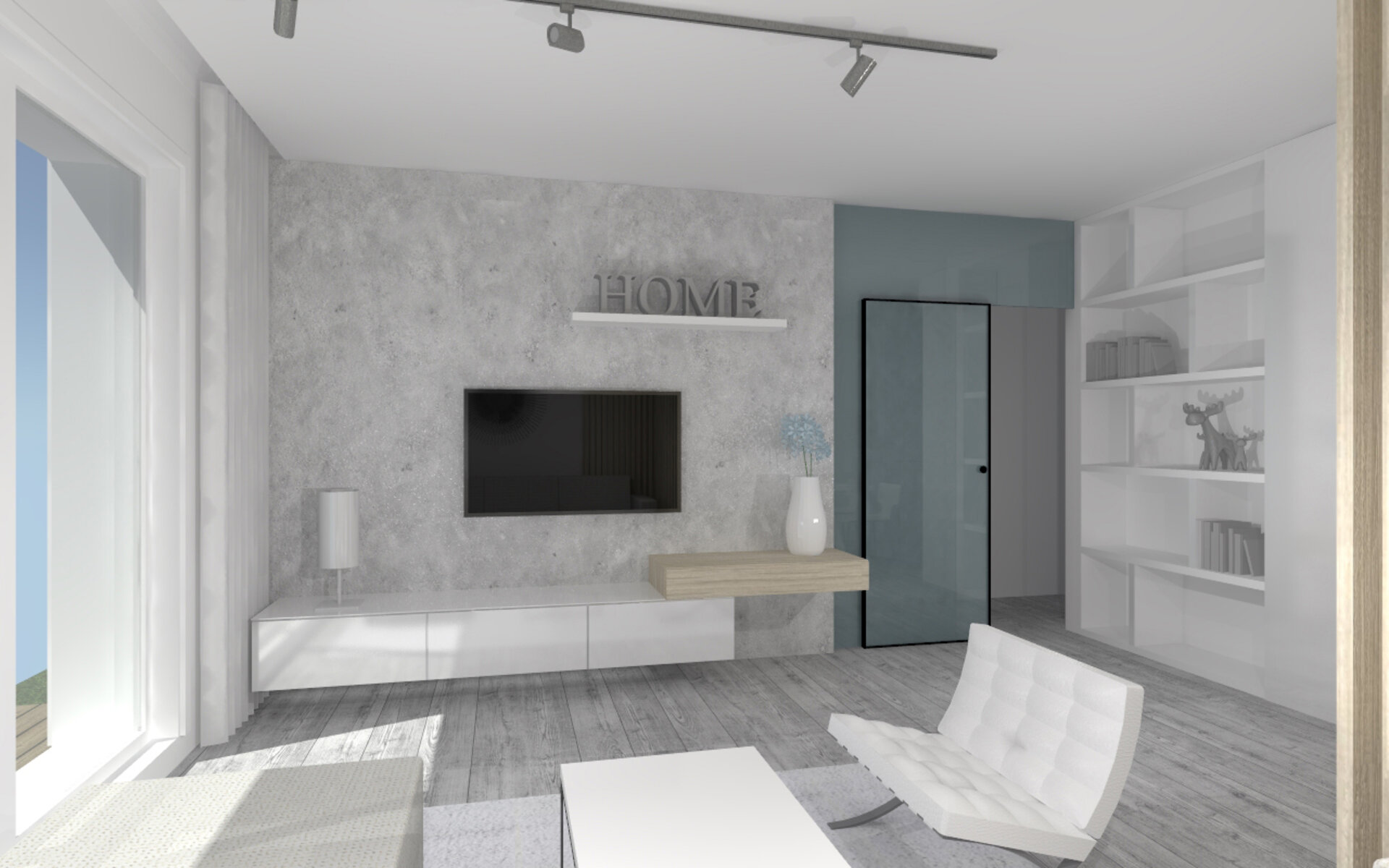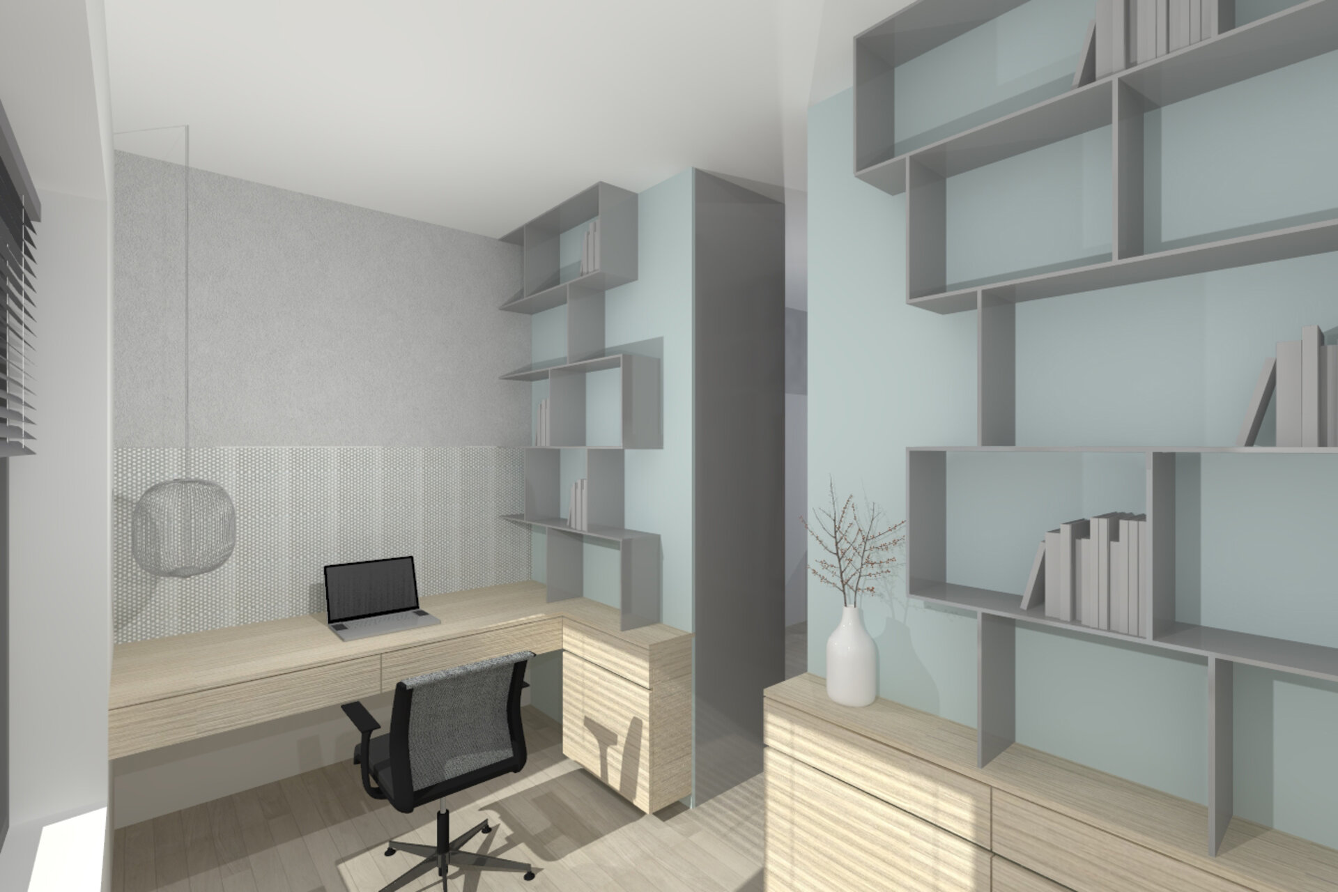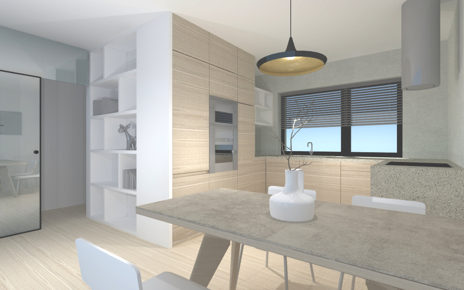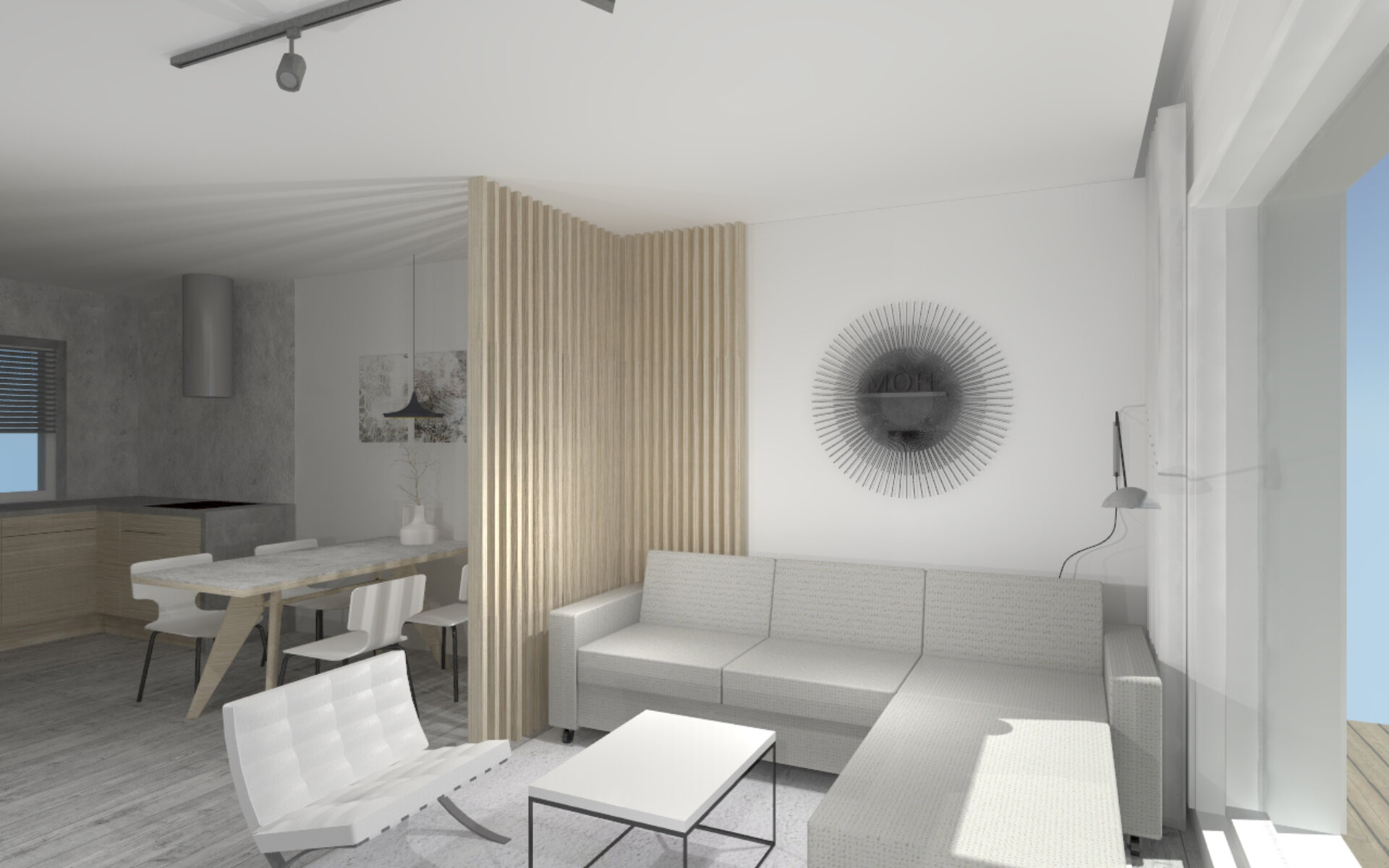 Návrh klientských změn a interiéru řadového RD. V přízemí došlo k vhodnému oddělení vstupních prostor se schodištěm prosklenou stěnou. Obytný prostor byl navržen v neutrálních odstínech, akcentován prostorovými lamelami a kuchyňskou linkou v dubové dýze.