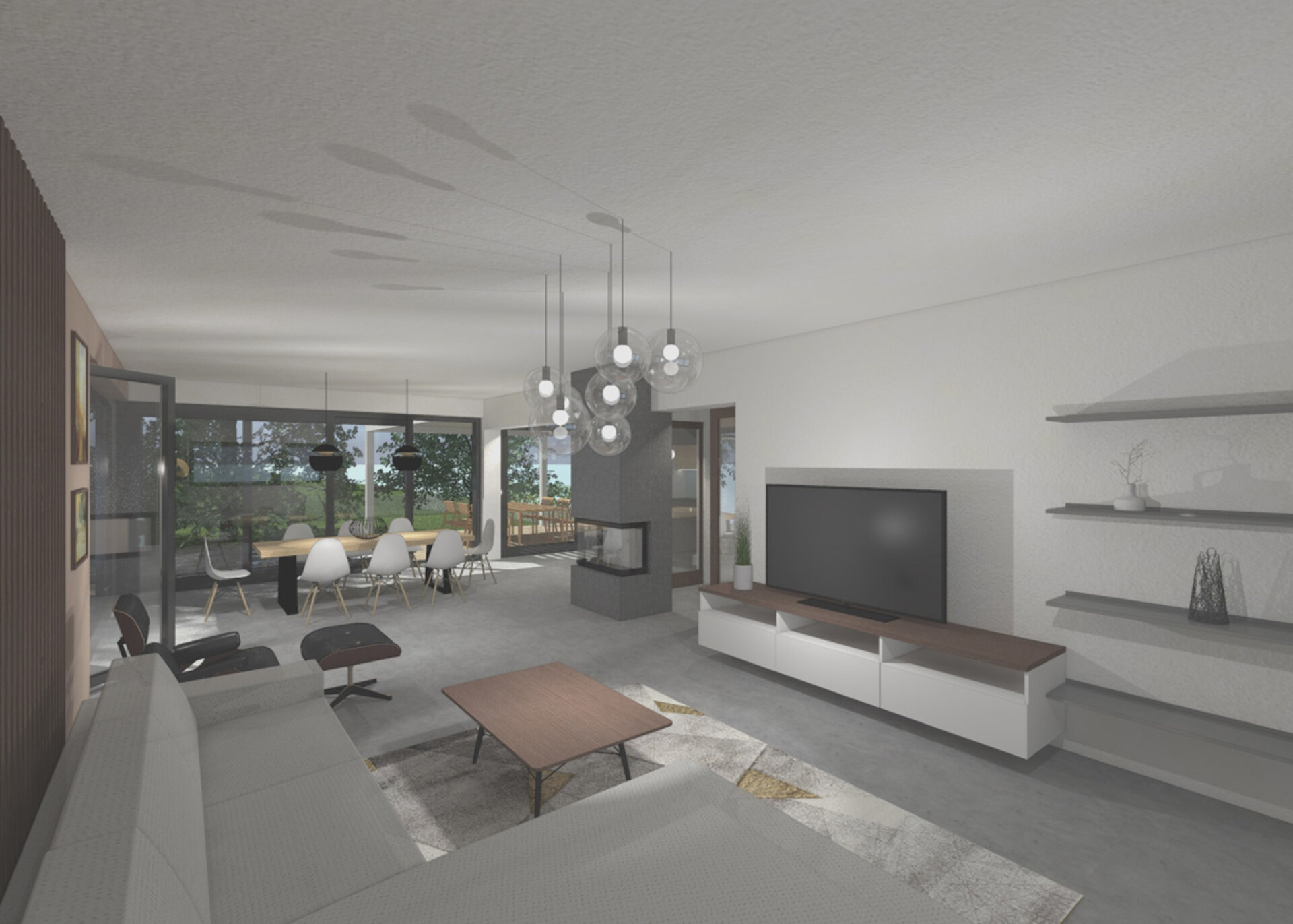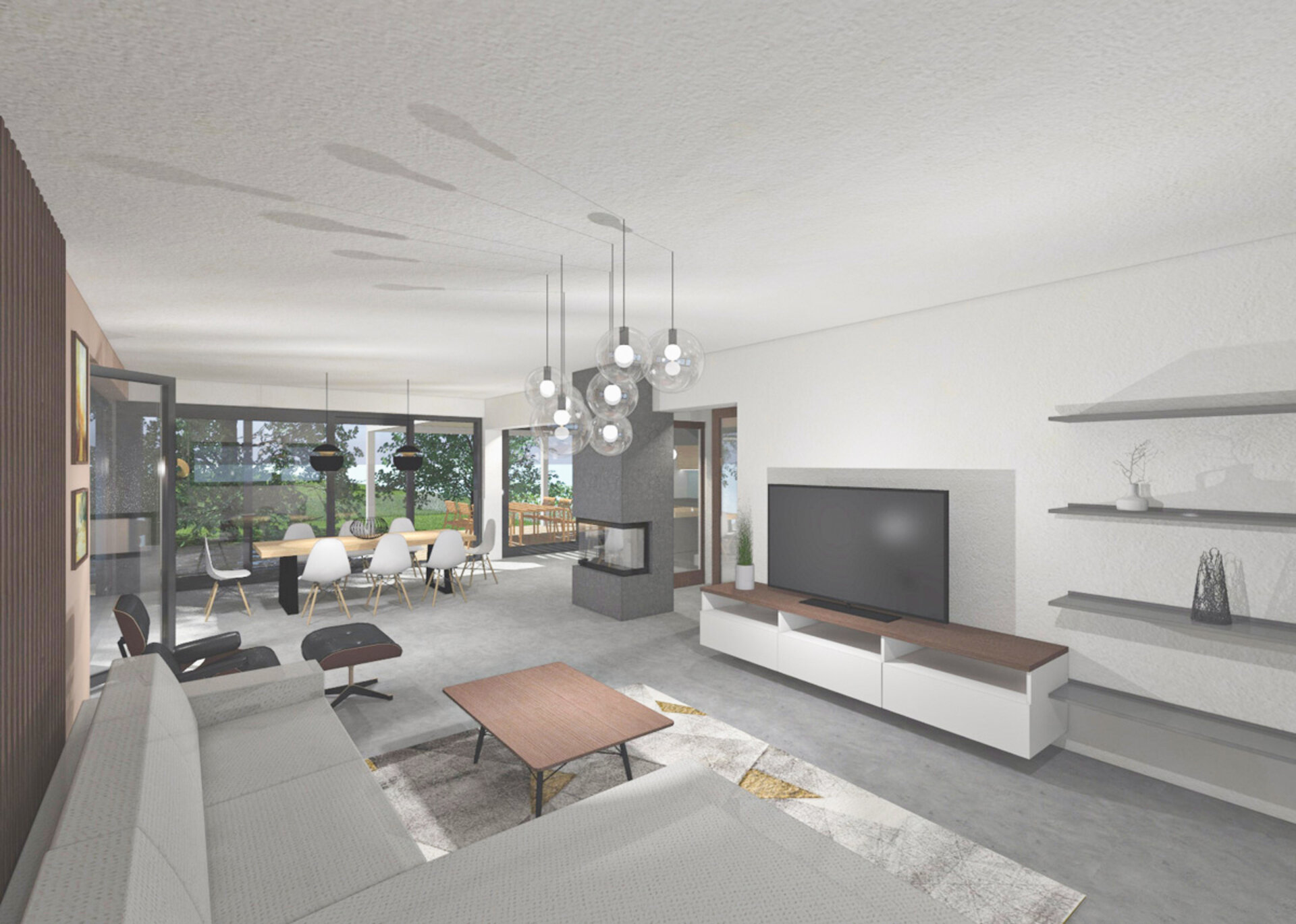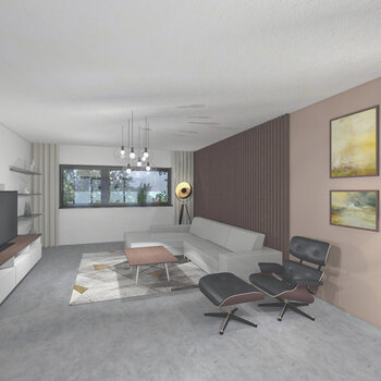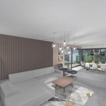 1/ V obývací části za velkou pohovkou dominuje vertikální laťování ze dřeva wenge na stěně v barvě taupe. Naproti pohovce je závěsná skříňka pod TV a minimalistické police z nerez plechu. Vedle pohovky je umístěno pohodlné křeslo s podnožkou přímo naproti centrálnímu třístranně prosklenému krbu. V prostoru zaujme designová stojací lampa se stínidlem ve tvaru zlatočerné polokoule, ale i koberec s geometrickým vzorem.
