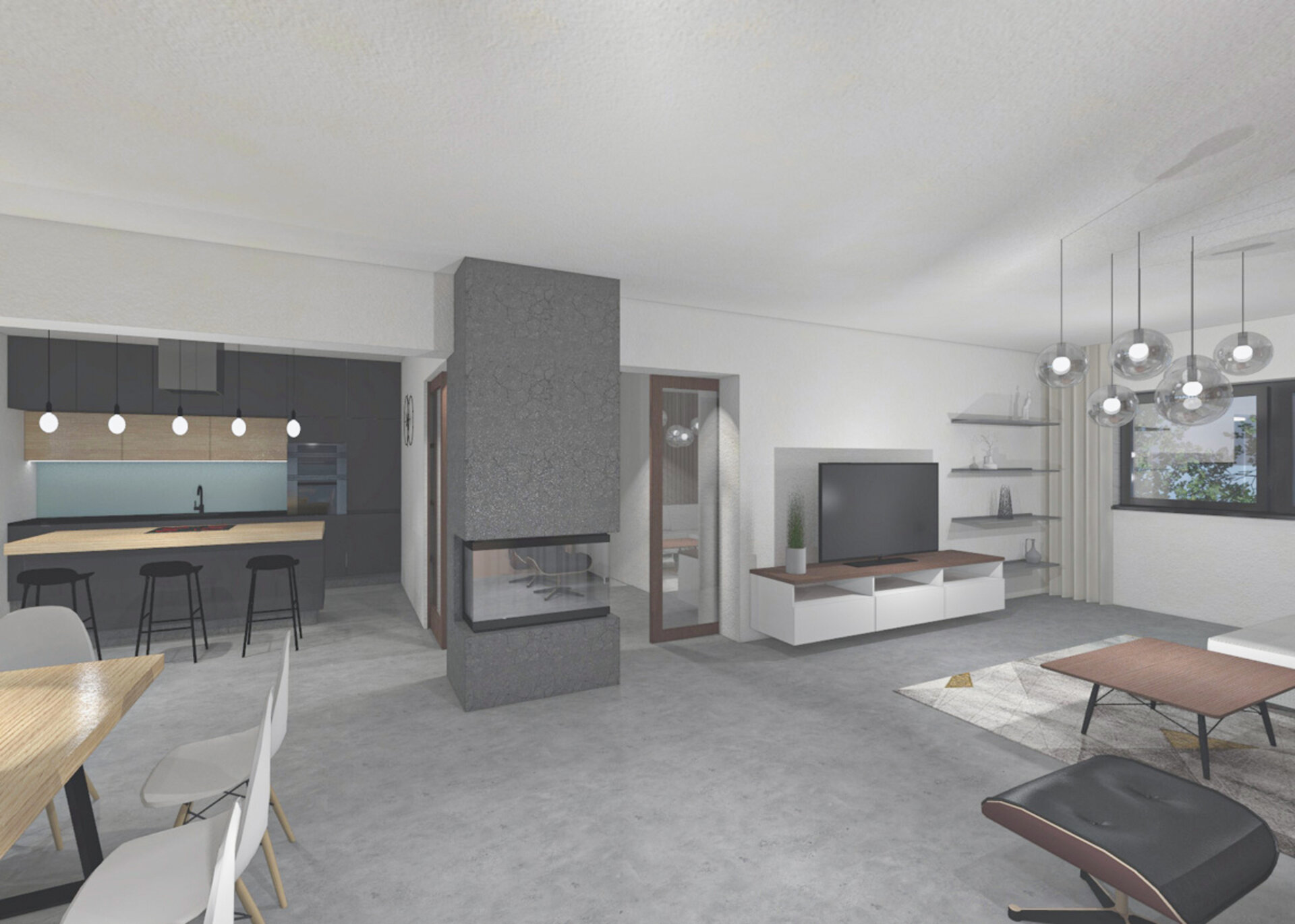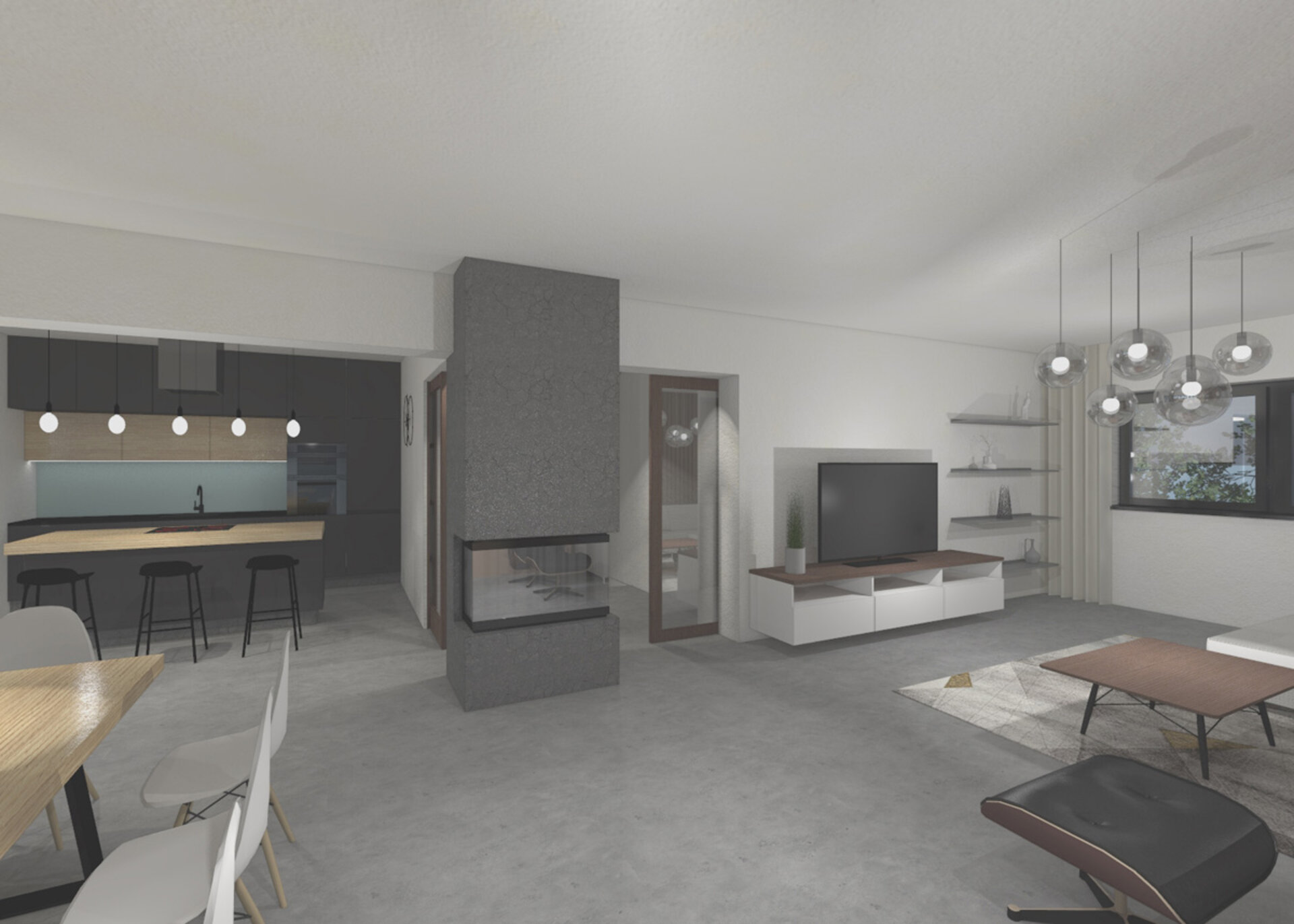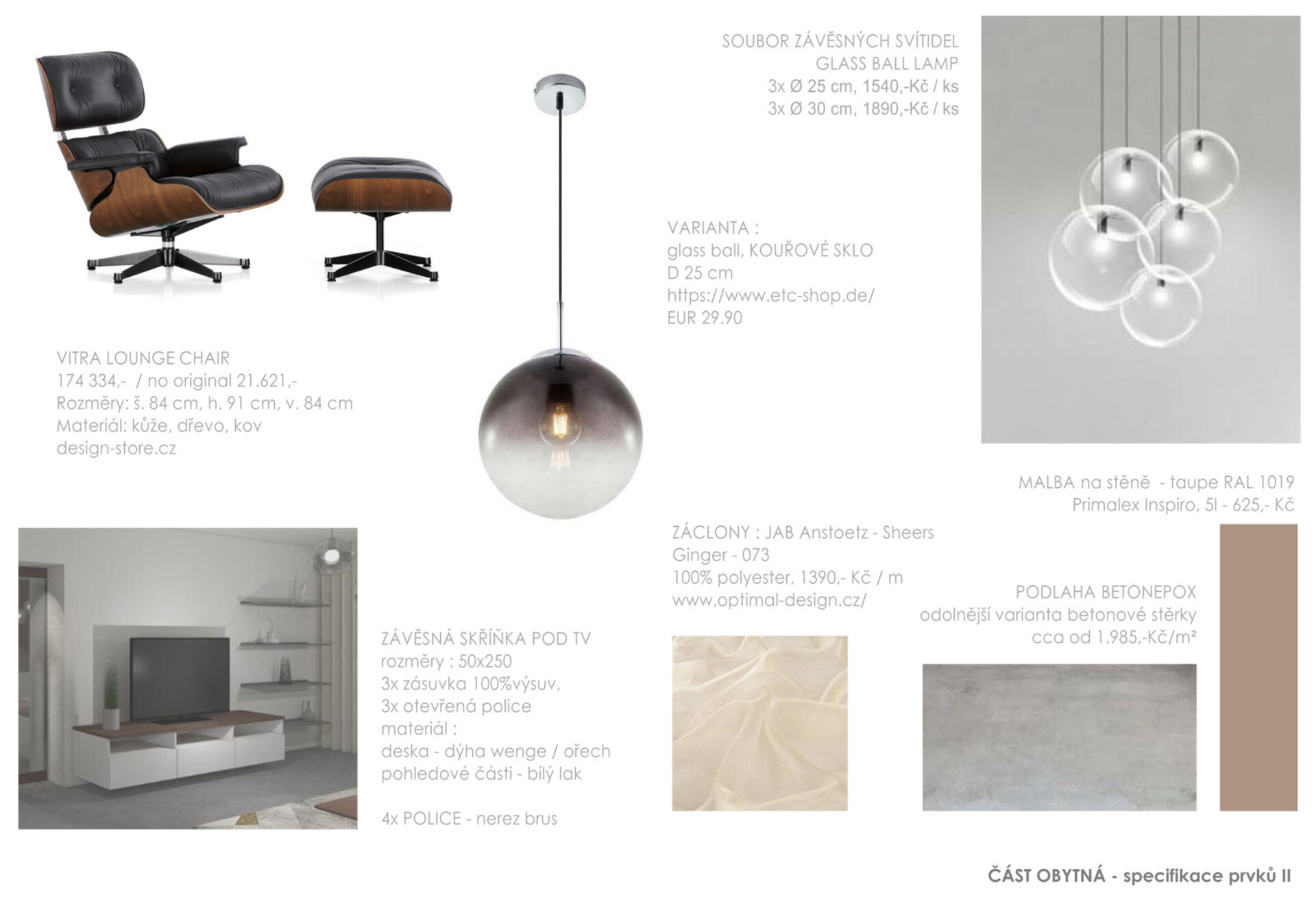 Nábytek, svítidla a dekorace pocházejí z exkluzivních i běžně dostupných obchodů. Kuchyňská linka a skříňka pod TV s policemi jsou navrženy k výrobě na míru. Na podlaze je litá vysokopevnostní betonová stěrka.