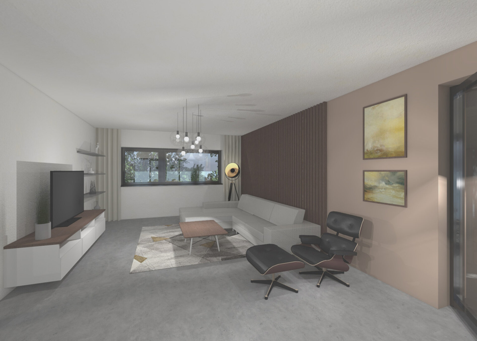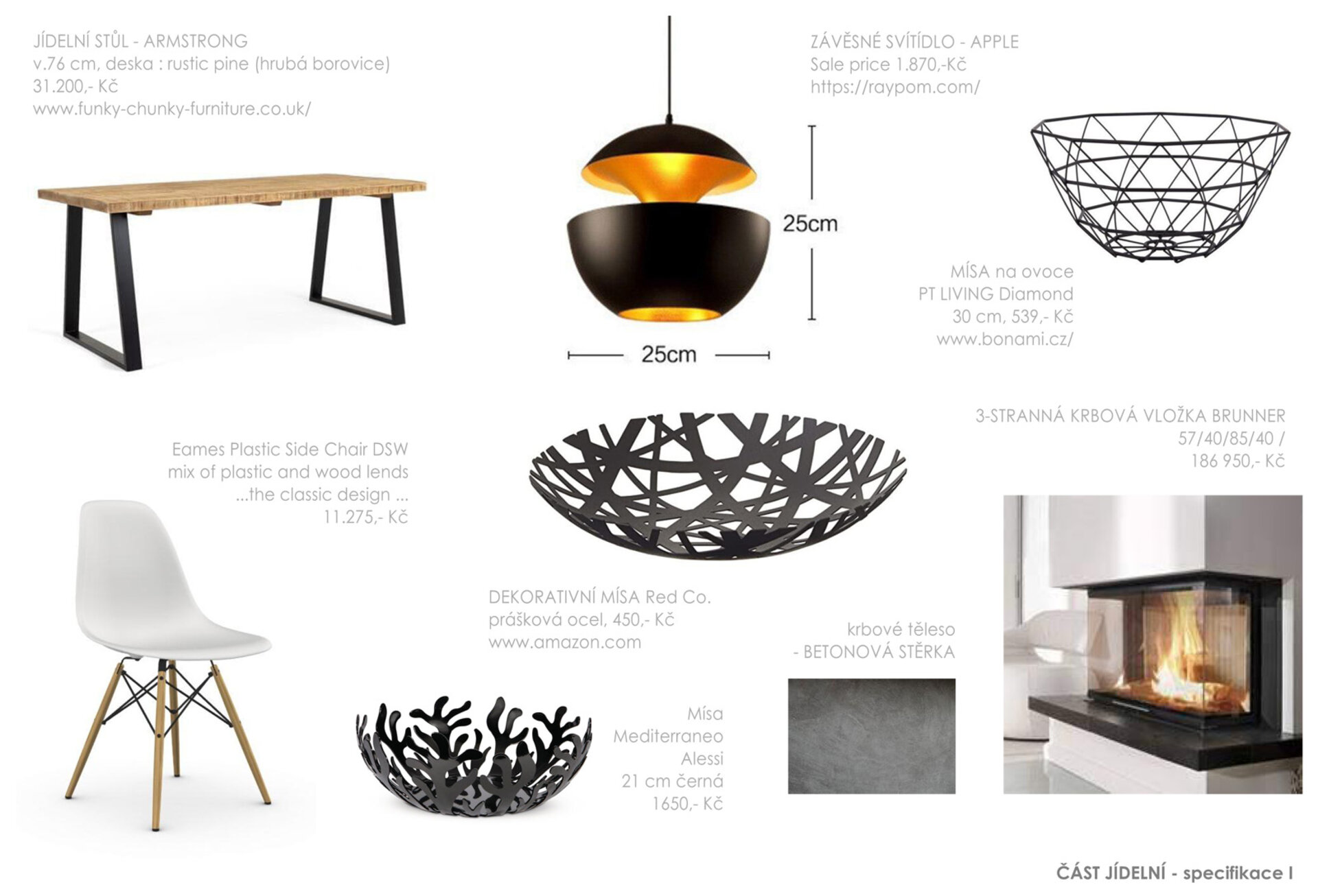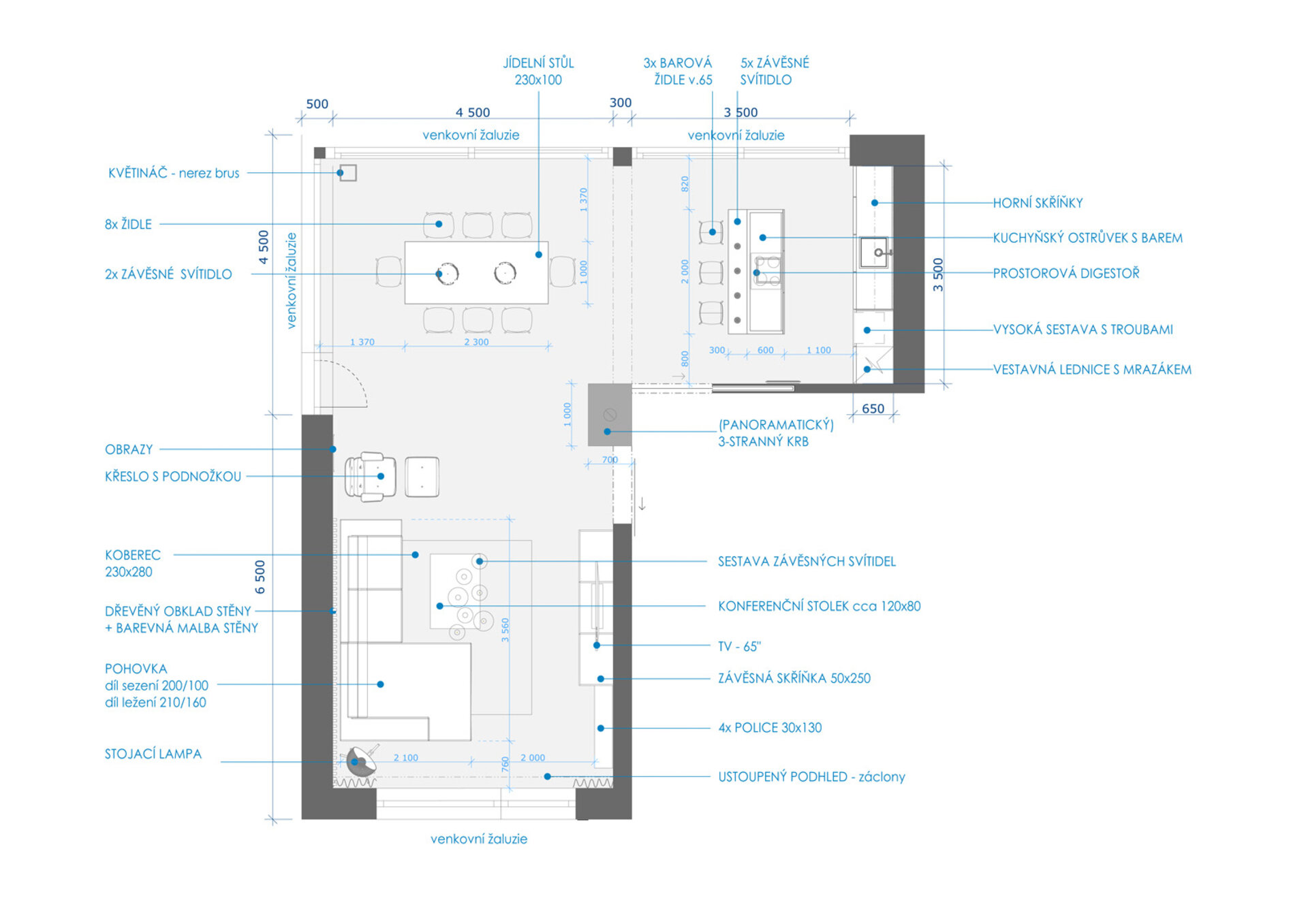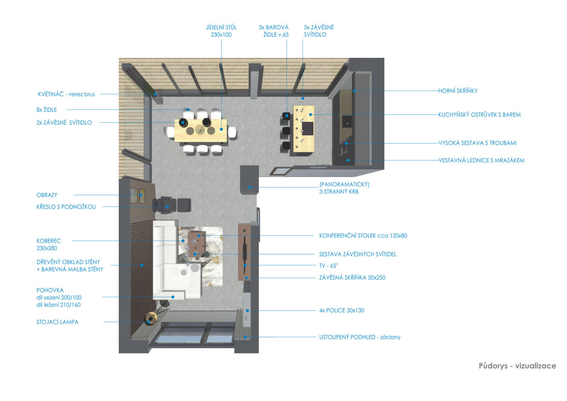 Nábytek, svítidla a dekorace pocházejí z exkluzivních i běžně dostupných obchodů. Kuchyňská linka a skříňka pod TV s policemi jsou navrženy k výrobě na míru. Na podlaze je litá vysokopevnostní betonová stěrka.