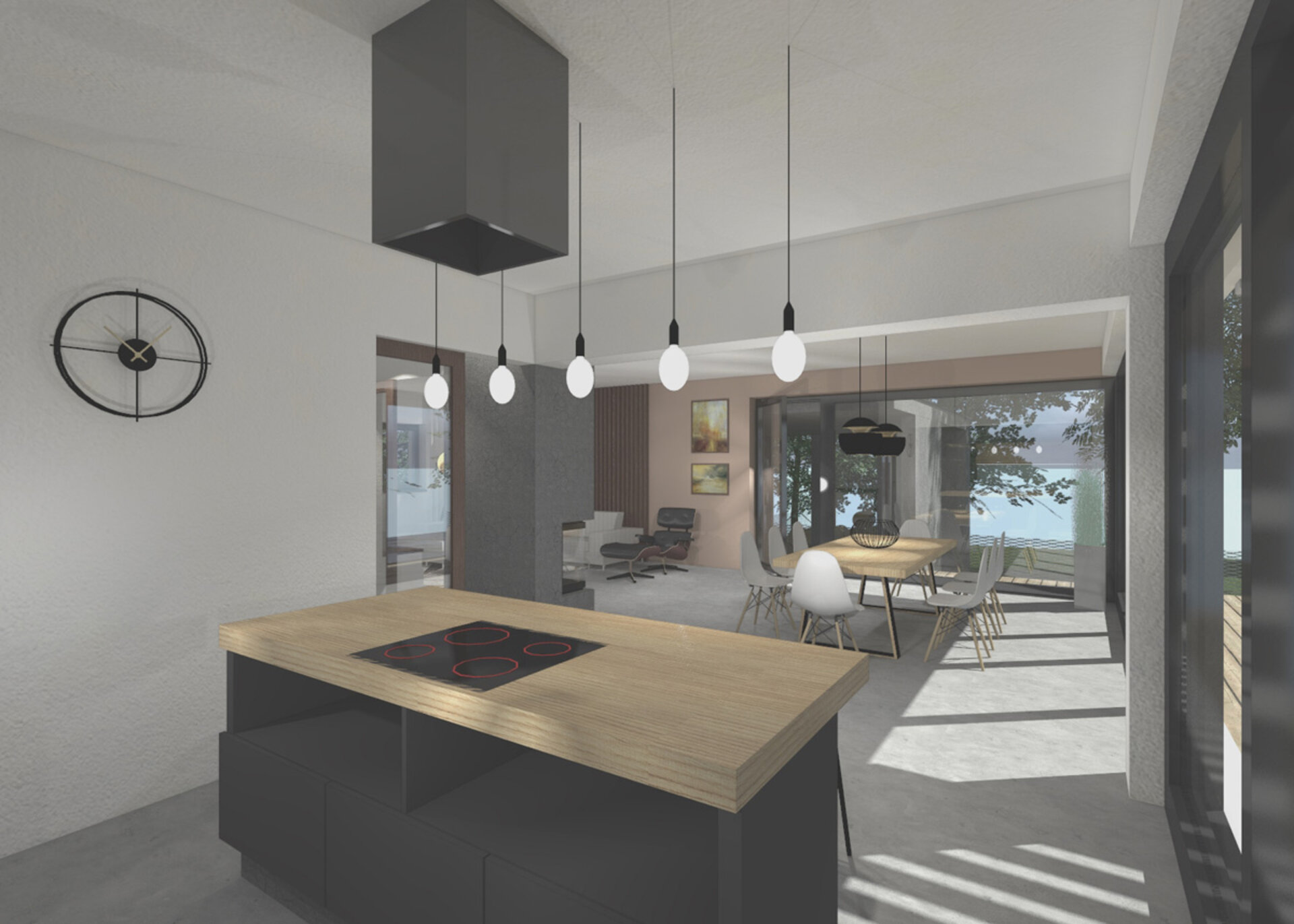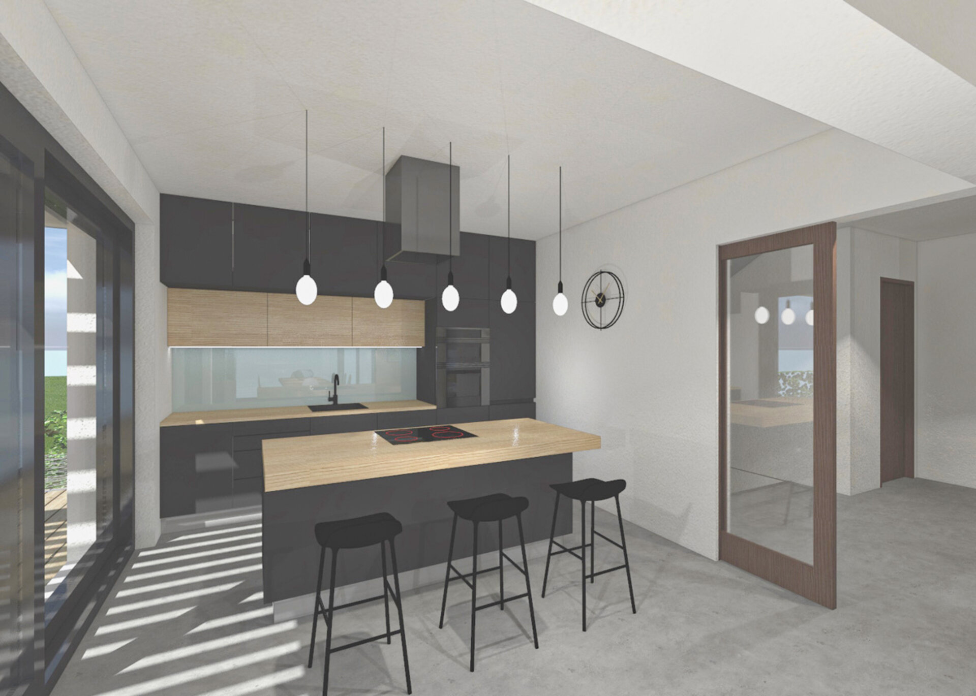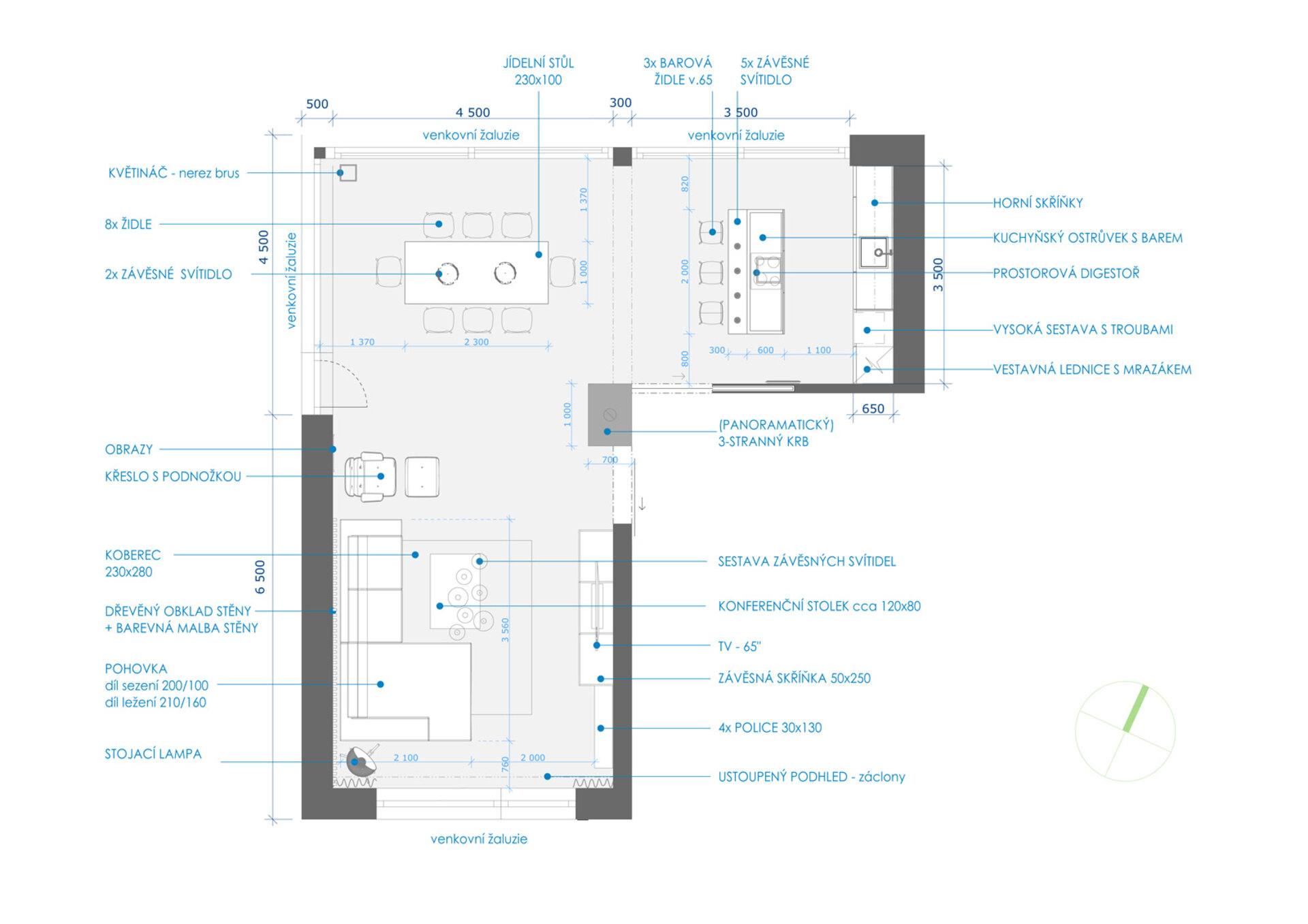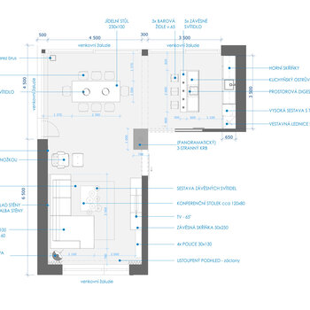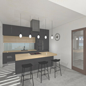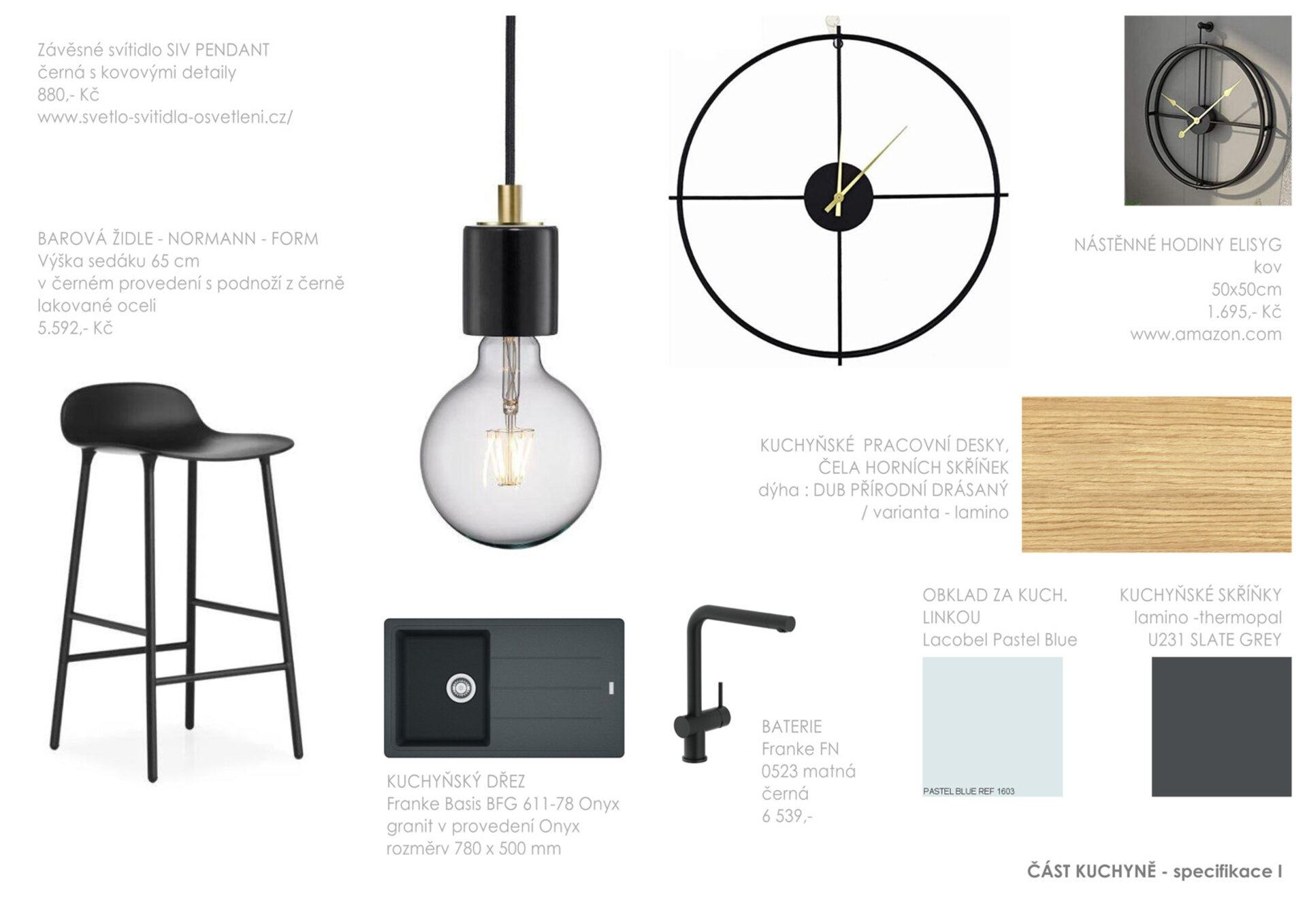 3/ Otevřený kuchyňský kout tvoří vestavěná linka a samostatný ostrůvek s barovým posezením. Kuchyňská linka je v tmavě šedé matné barvě, kombinované s dubem a pastelově tyrkysovým Lacobelem. Nad ostrůvkem je umístěna minimalistická digestoř a řada žárovek. Zlatý akcent zde tvoří ručičky od nástěnných hodin.