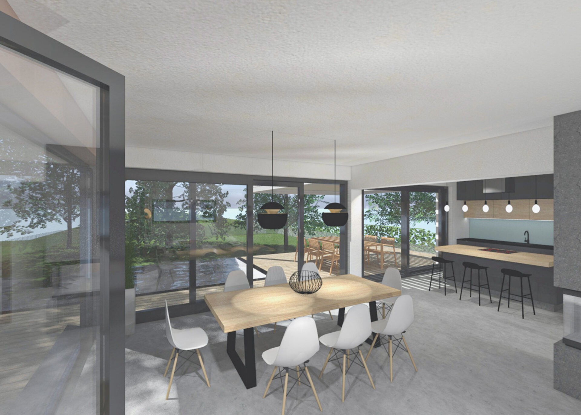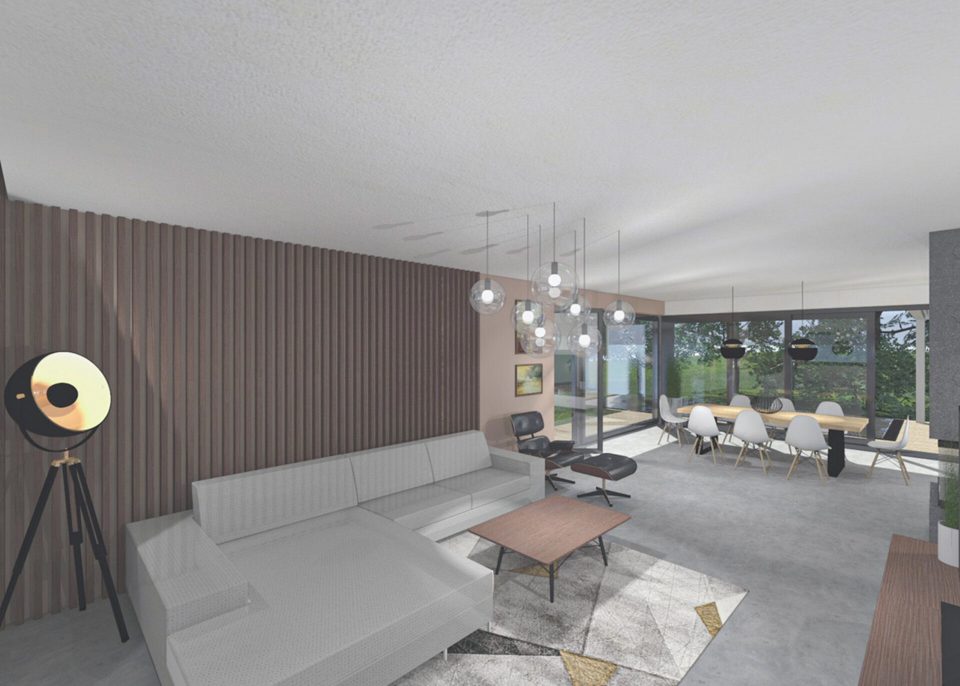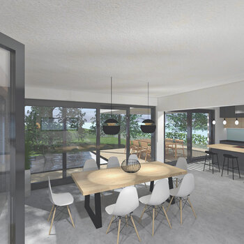 2/ Jídelní část v proskleném rohu místnosti nabízí výhled do zahrady. Stůl pro 6-8 osob má desku z drásaného dubu a černou kovovou podnož. Židle s jemně členitou podnoží jsou v bílé barvě, zatímco svítidla nad stolem opět přitahují pozornost zlatým detailem.