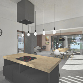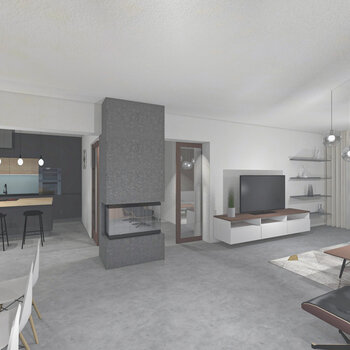 Cílem bylo vytvořit interiér s funkčně rozdělenými zónami, laděný do elegantních chladných tónů, s prvky industriálního stylu a zlatými akcenty.