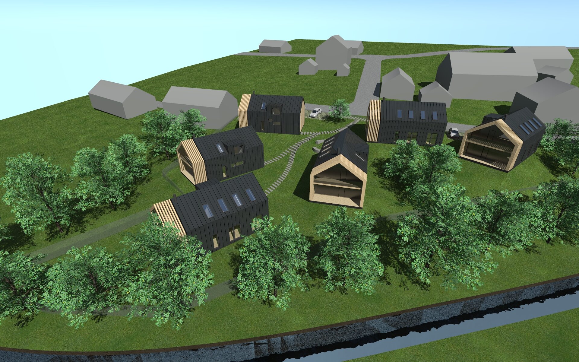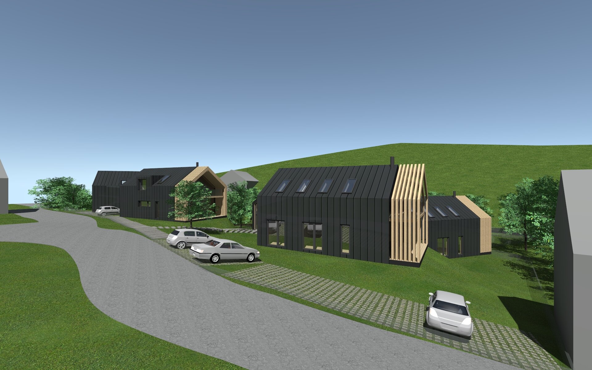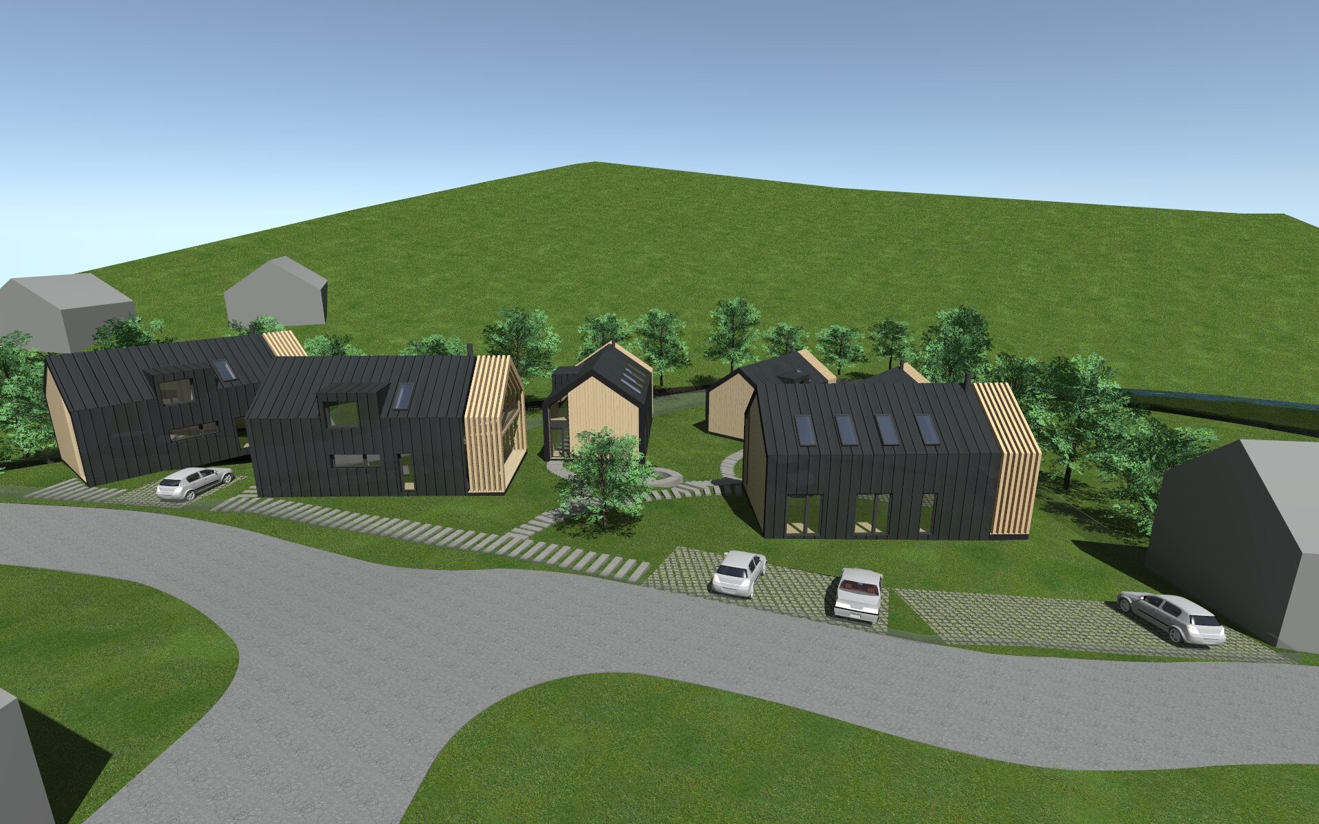 Rychlá hmotová studie apartmánových domů na svažitém pozemku.