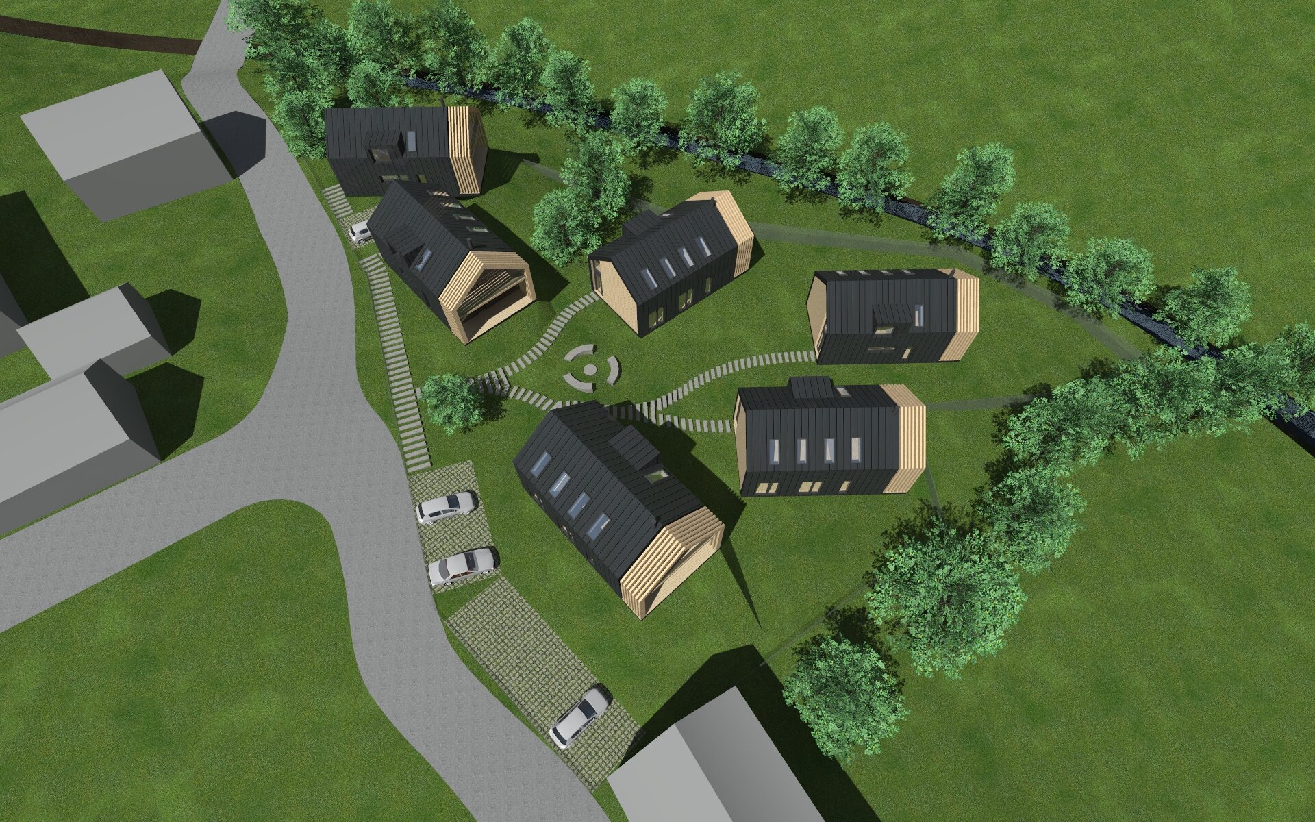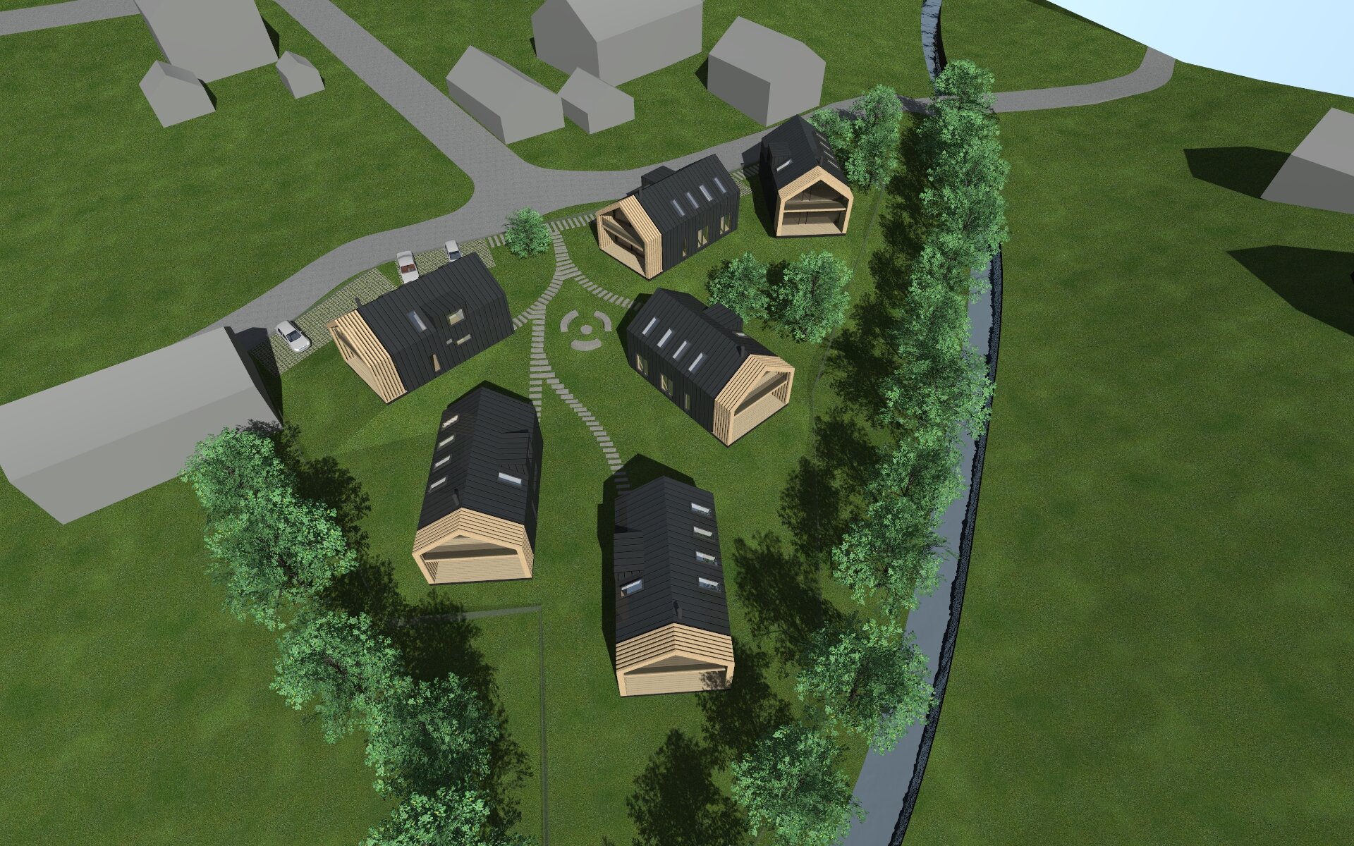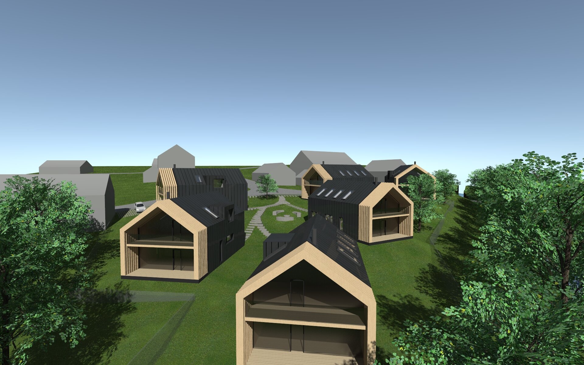 Rychlá hmotová studie apartmánových domů na svažitém pozemku.
