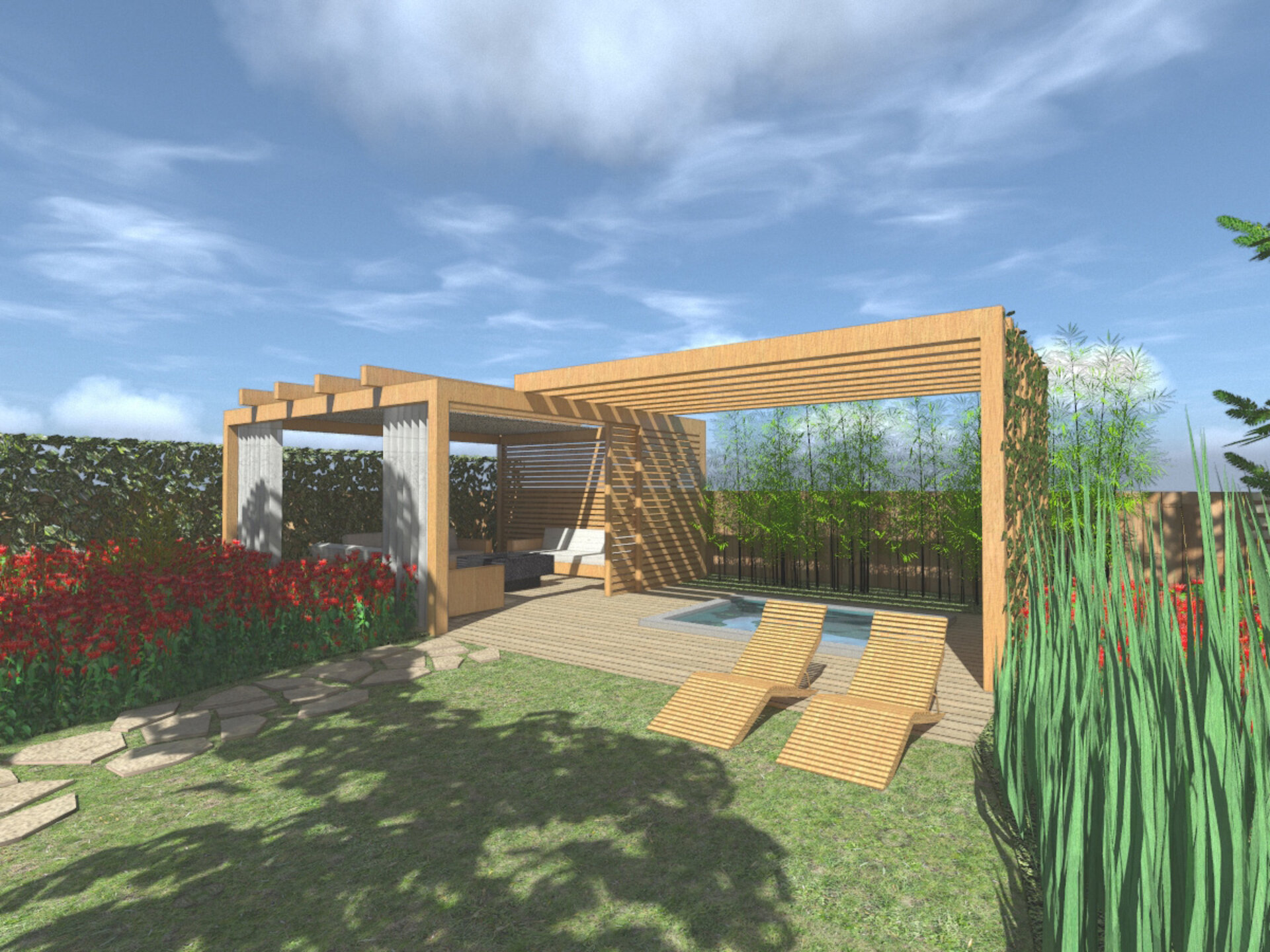 Vedle pergoly je umístěna zapuštěná vířivka, lehce ukrytá sloupky a trámky, které se propojují s hlavní pergolou. Dřevěné prvky lze snadno obohatit popínavými rostlinami, čímž se zahrada ještě více propojí s přírodním okolím.