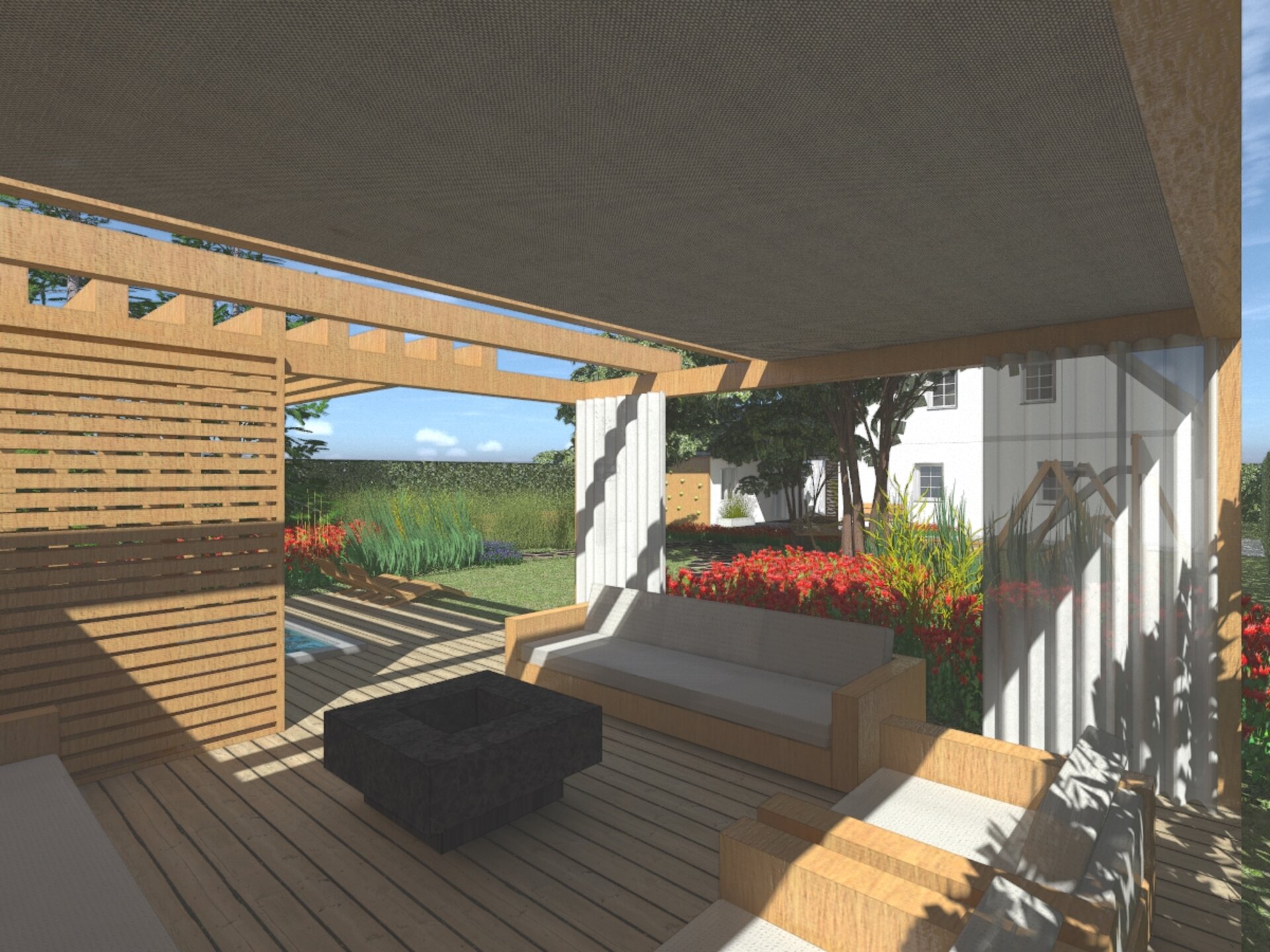 Ústředním motivem zahrady je relaxační terasa umístěná v severozápadním rohu, kterou zastřešuje vzdušná dřevěná pergola. Je zde umístěno rozměrné pohodlné sezení kolem centrálního kamenného ohniště. Pergolu obklopuje živý plot a laťování, které poskytují potřebné soukromí. Posuvné lamelové stěny a romantické závěsy přidávají pergole útulnost. Pro ochranu před sluncem i deštěm je pergola vybavena rolovací UV a voděodolnou clonou.