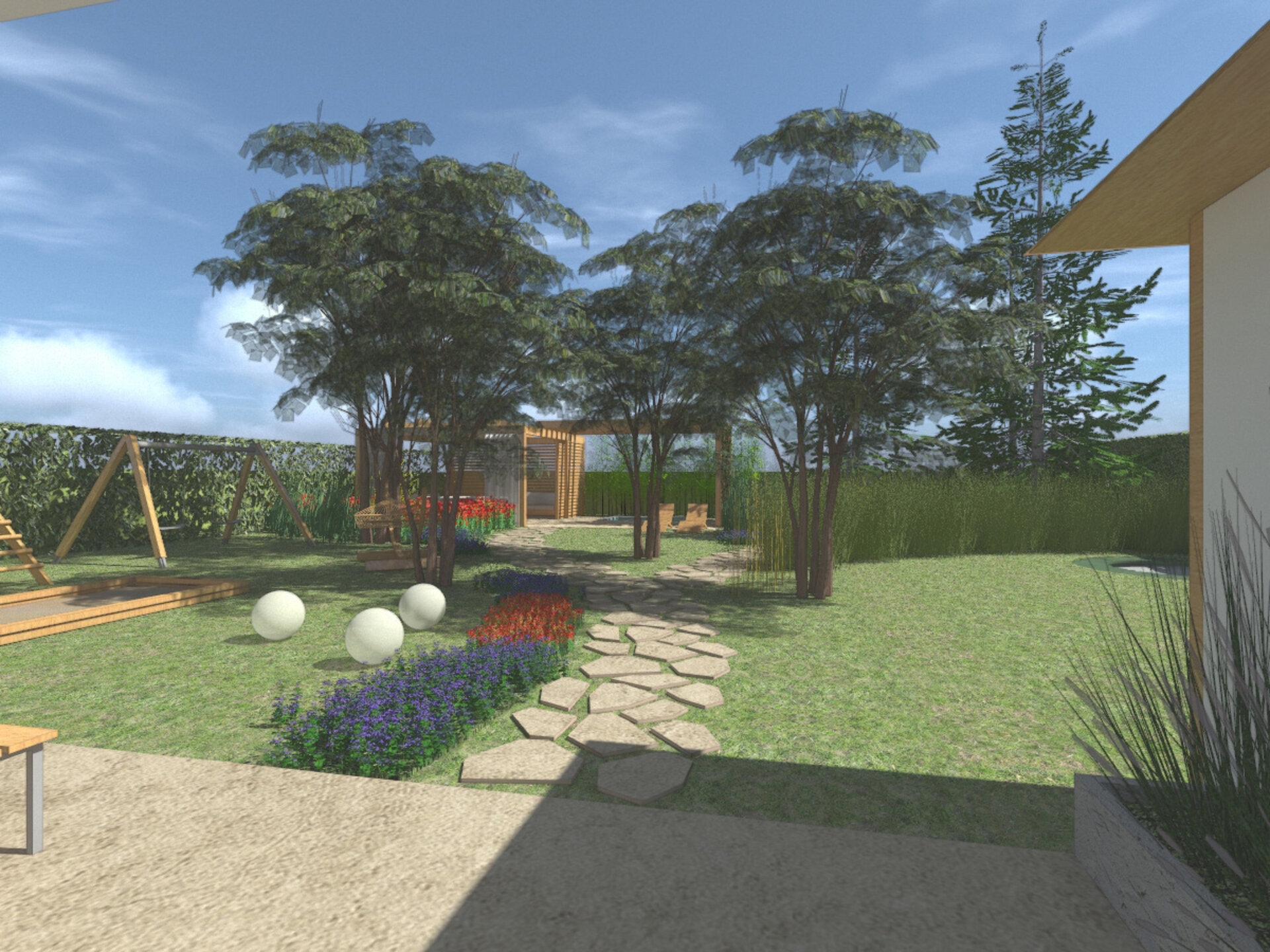 Tento návrh představuje zahradu promyšleně členěnou dvěma cestami z nášlapných kamenů zasazených do trávníku, které propojují hlavní části zahrady a přirozeně směřují návštěvníky buď na terasu s pergolou, nebo k lavičce pod borovicemi.