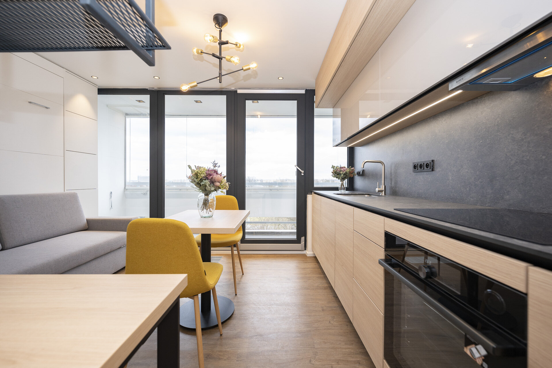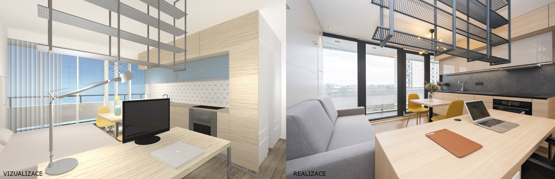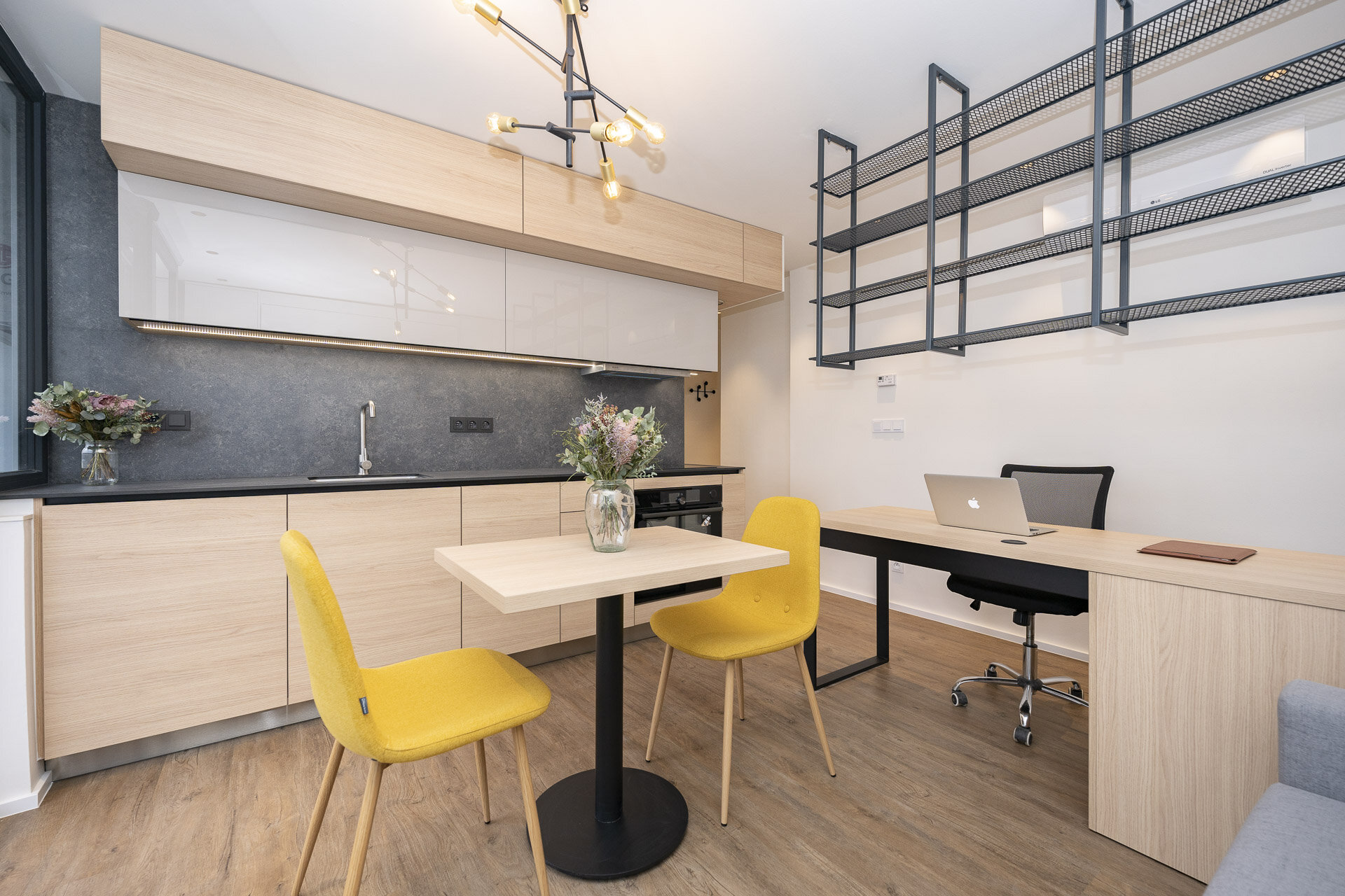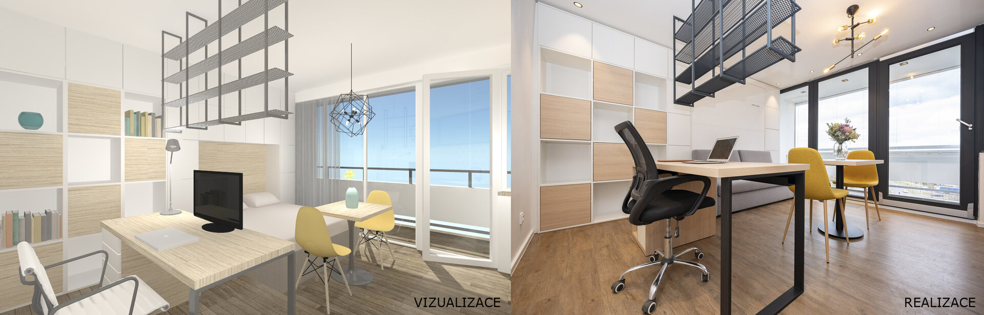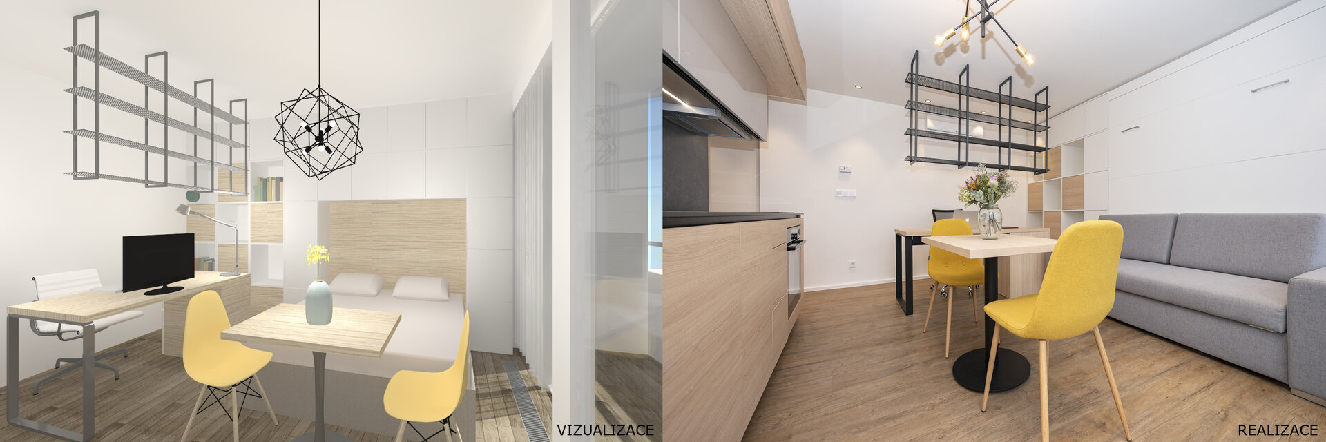 Proměna malé garsonky pro mladého studenta přinesla maximální využití prostoru a moderní komfort. Nová dispozice zahrnuje funkční hygienické zázemí s oknem a flexibilní obytný prostor s kuchyňským koutem, místem na spaní i pracovním stolem.