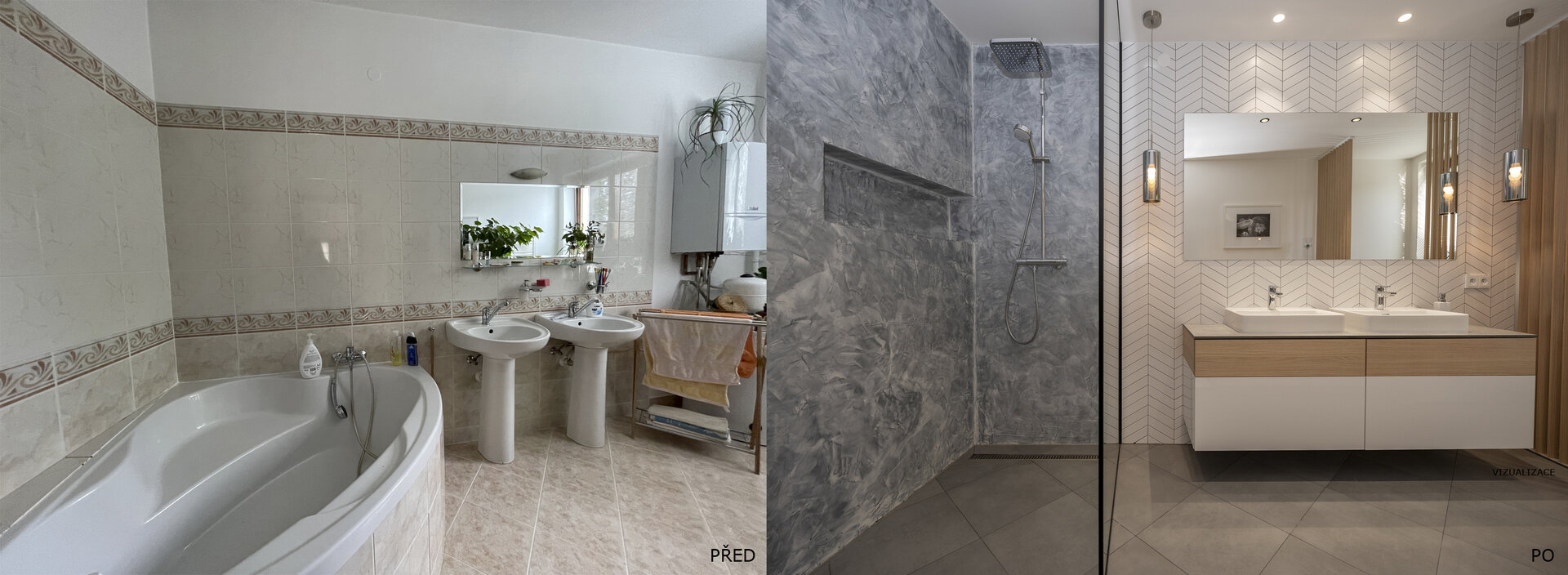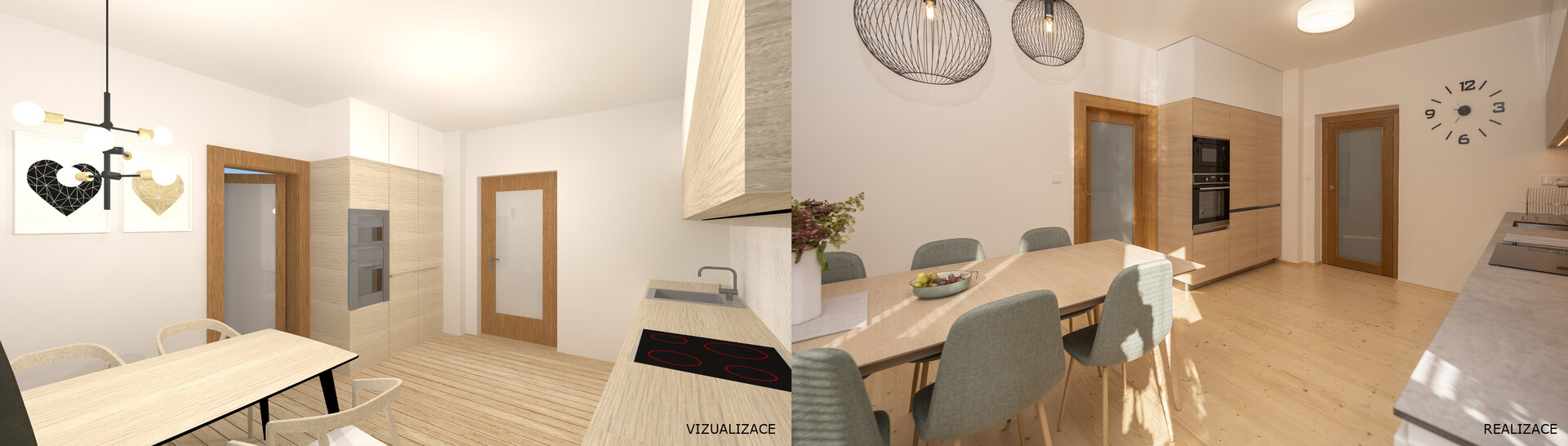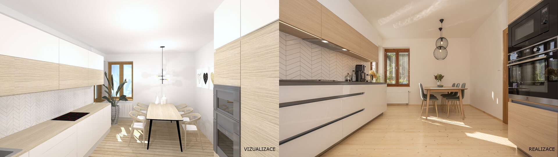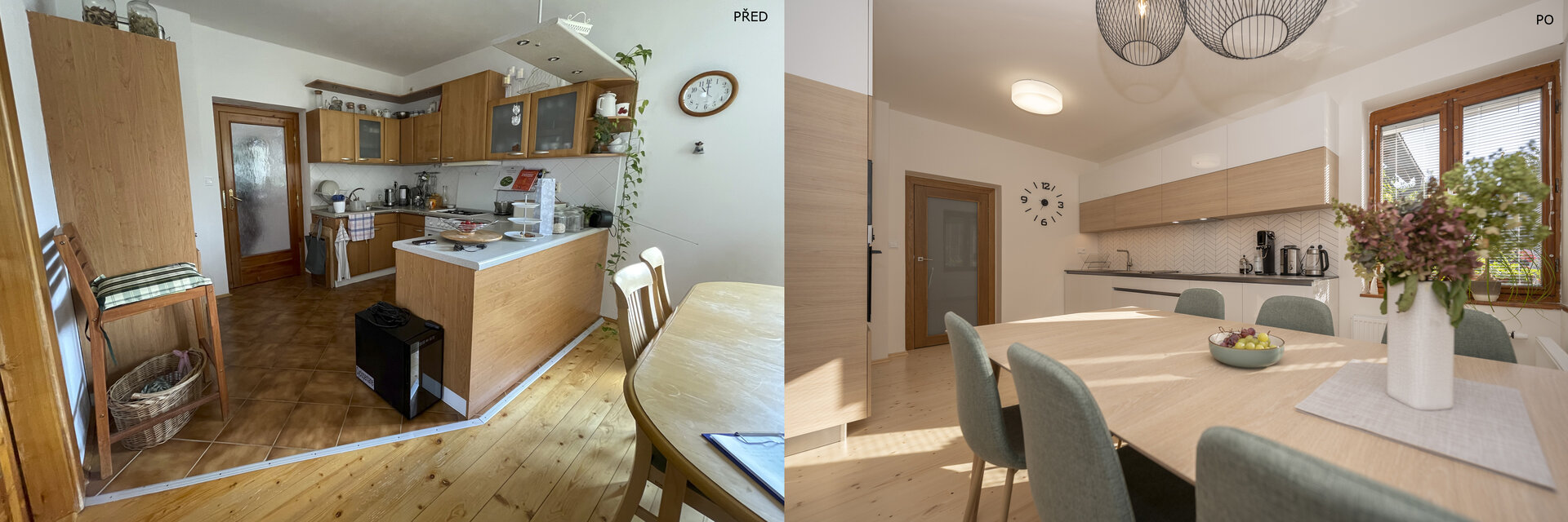 Návrh nové kuchyně s jídelnou a koupelny ve venkovském rodinném domě.