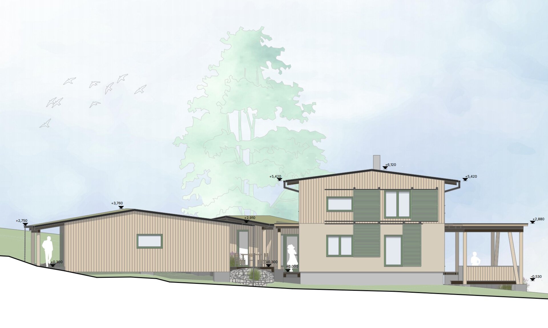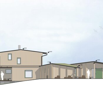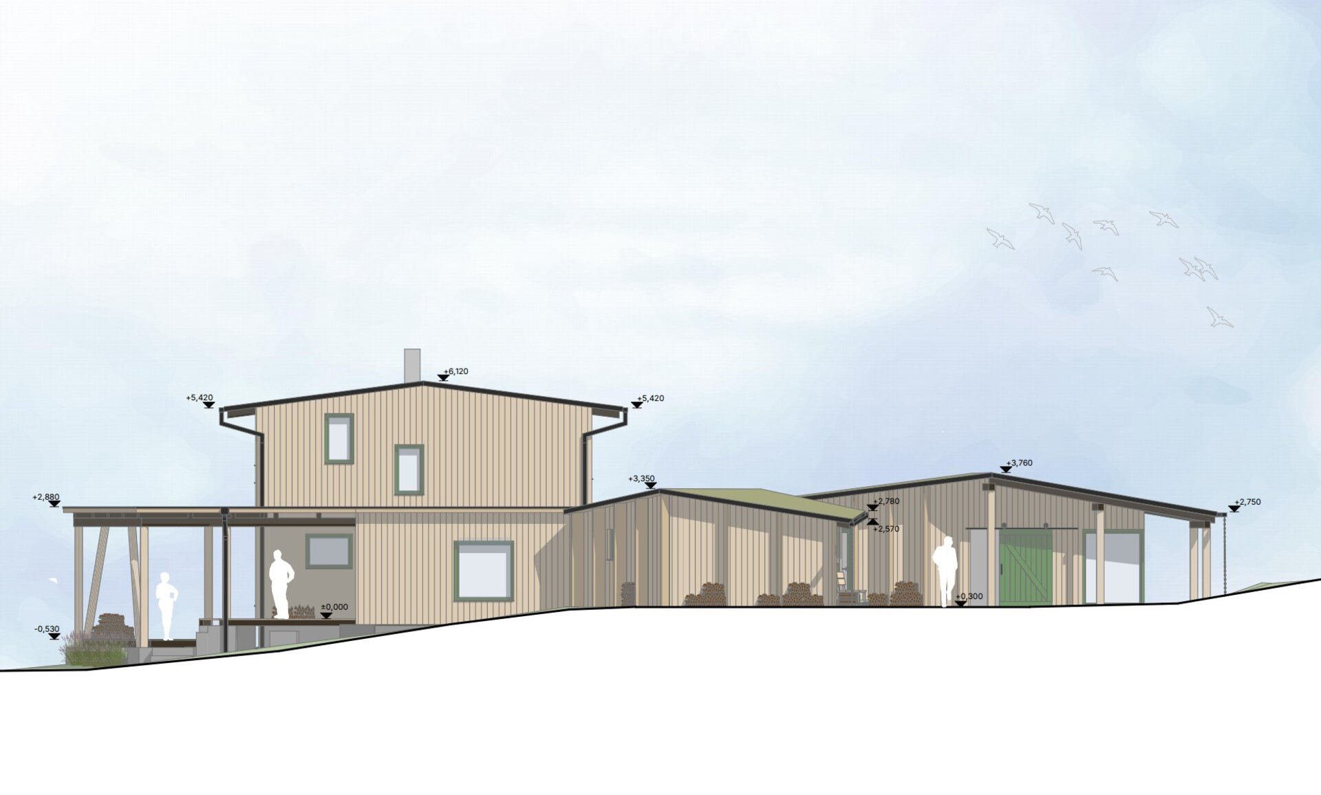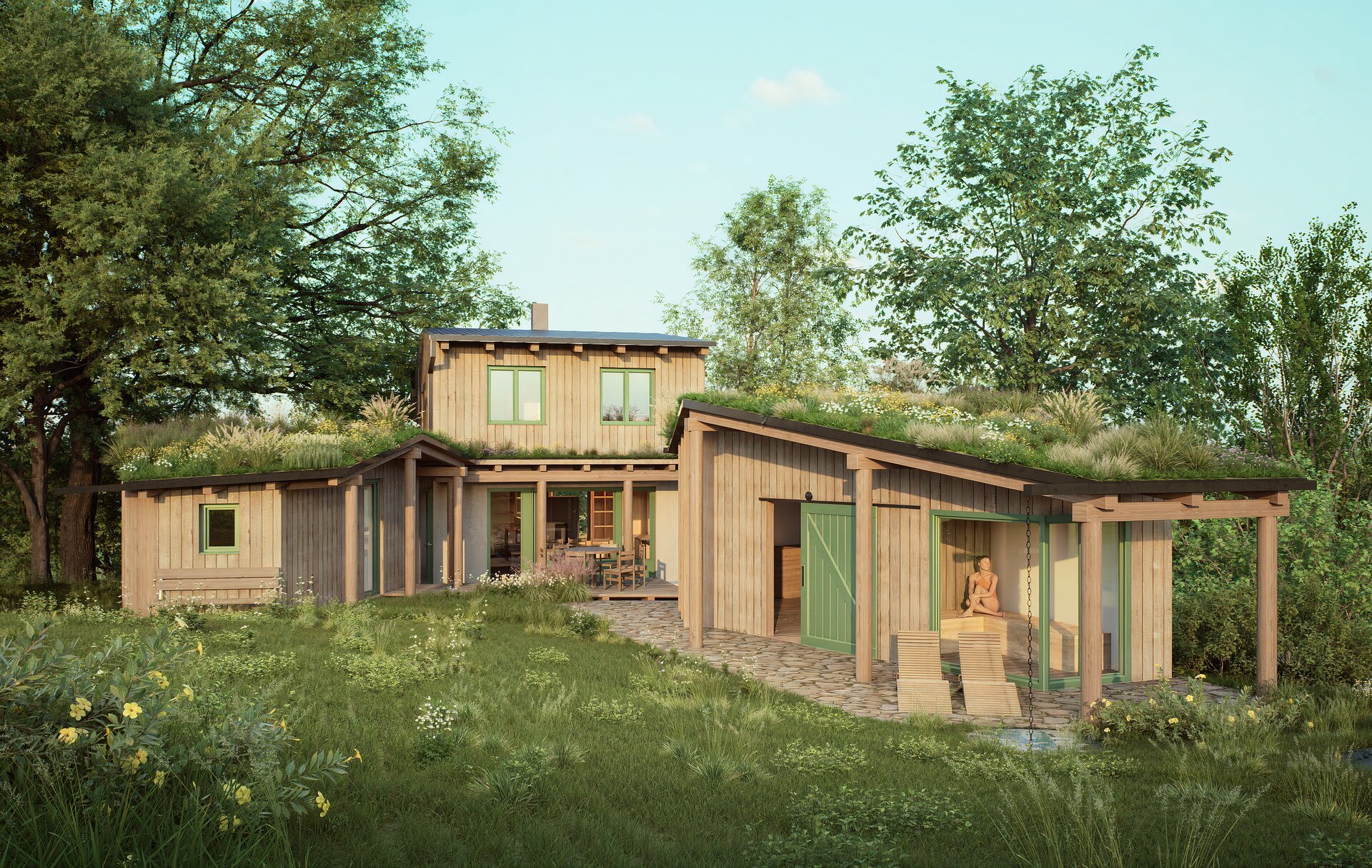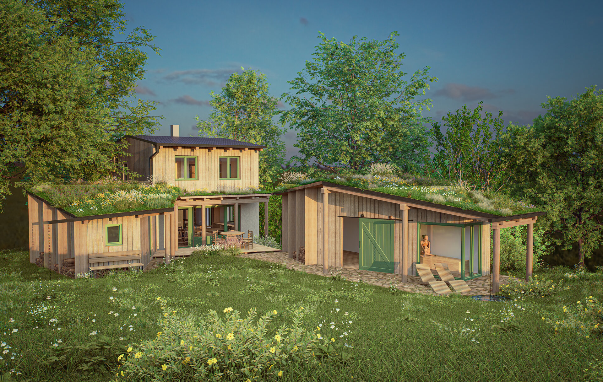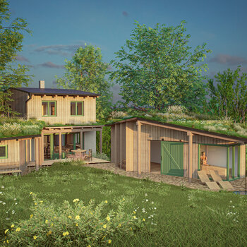 Uprostřed stojí hlavní dům – plně soběstačná dřevostavba pro pětičlennou rodinu.