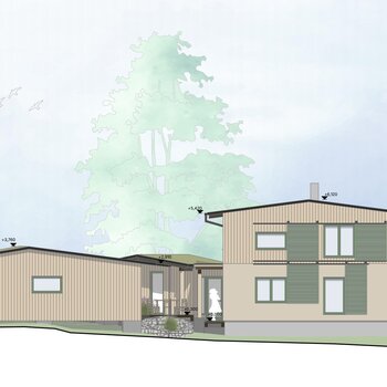 Z pohledu zahrady tyto tři domy vytvářejí otevřenou náruč kolem slunného dvorku, zatímco na opačné straně se dům otevírá lesu.